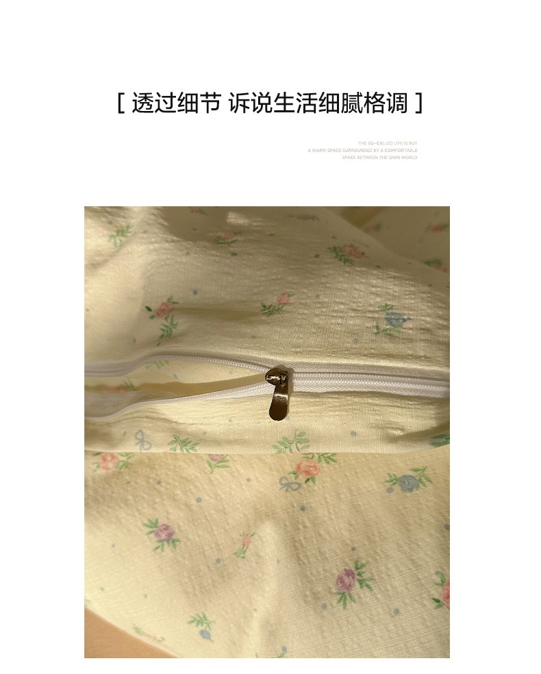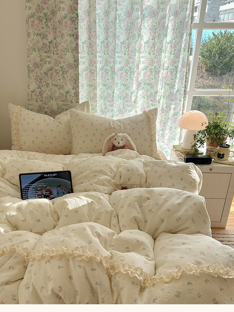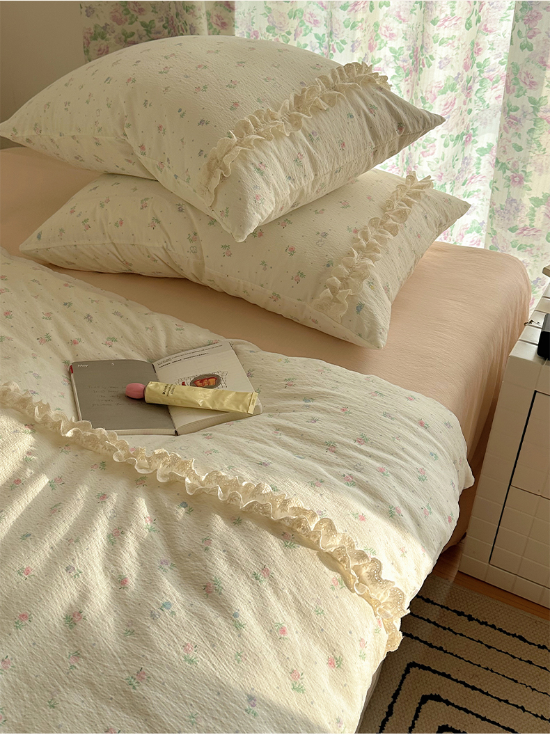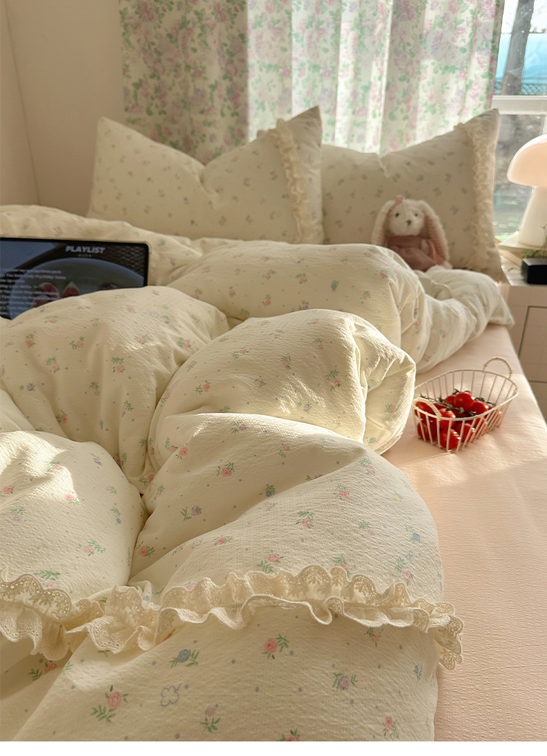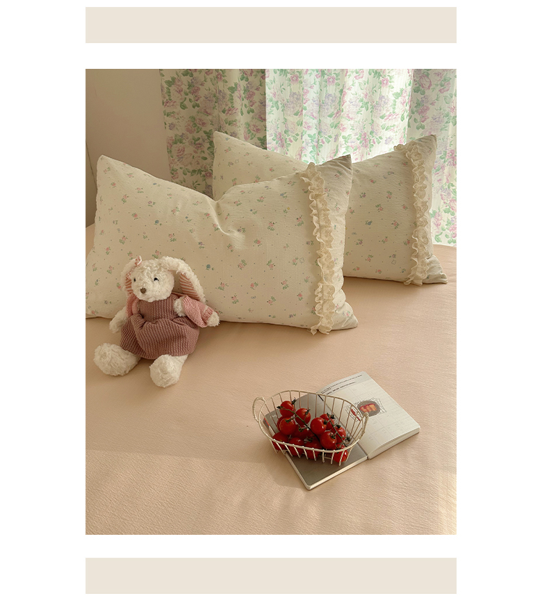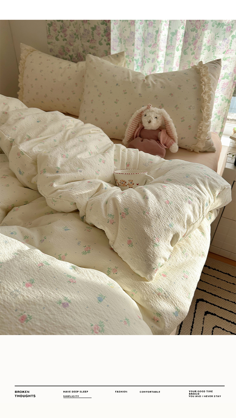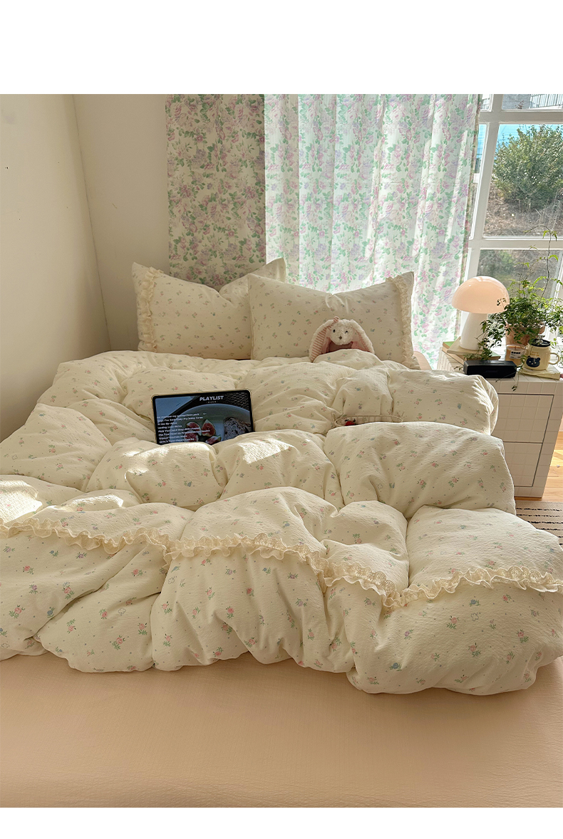 山茶家居-原创设计(原山茶家纺) 2026新款皱皱纱水洗棉花边四件套-清雾系列 清雾-小粉花