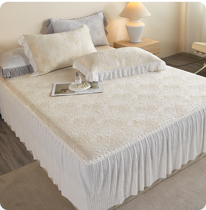 (总)桂雅居 2026新款高分子冰感蕾丝床裙床笠款凉席三件套,浅夏桃风,清氧浅绿,柔雾奶咖,素影灰纱,云漫冰蓝