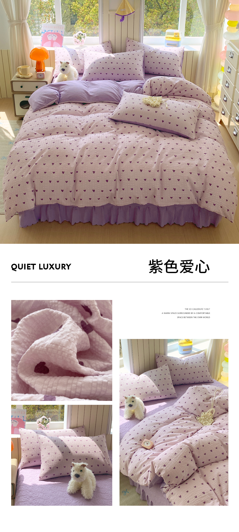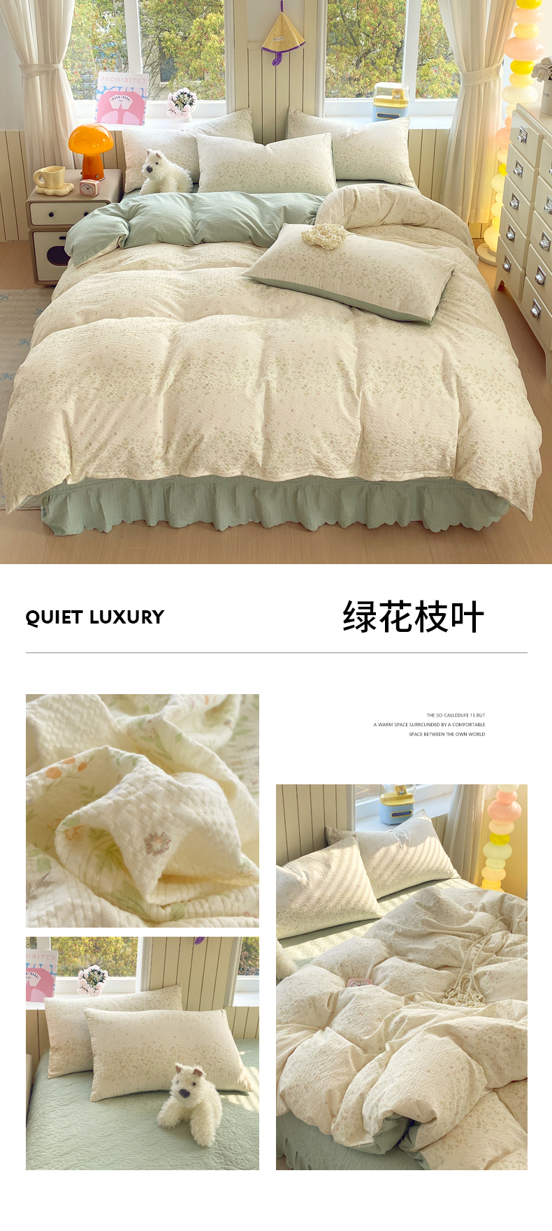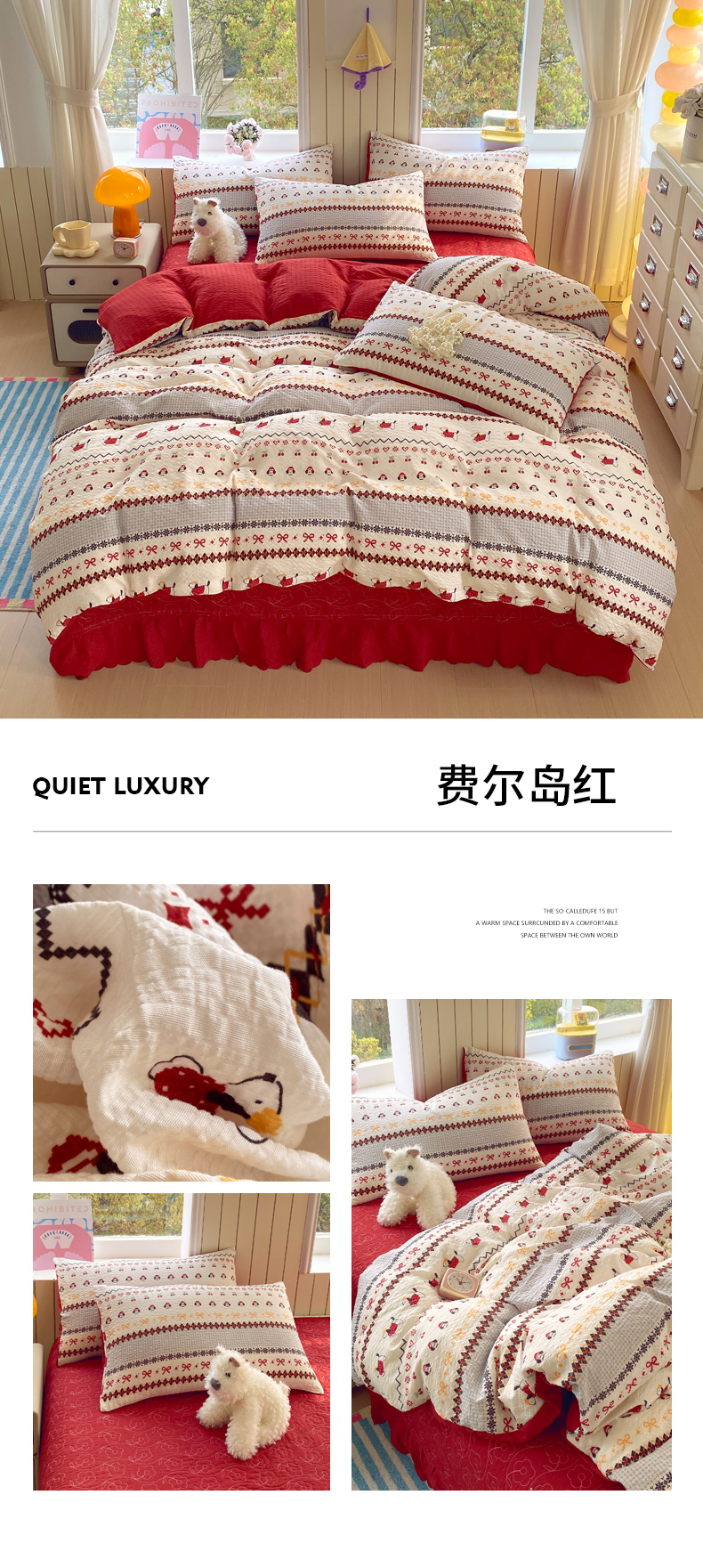 (总)莱米家纺 2026新款云感泡泡纱双层纱床盖四件套,海底星星,费尔岛红,费尔岛咖,费尔岛紫,卡其波点,绿花枝叶,绿樱桃,兔兔之家,星星人,紫色爱心,棕蝴蝶结