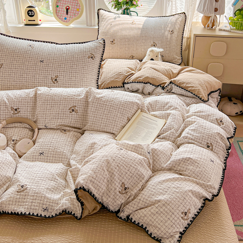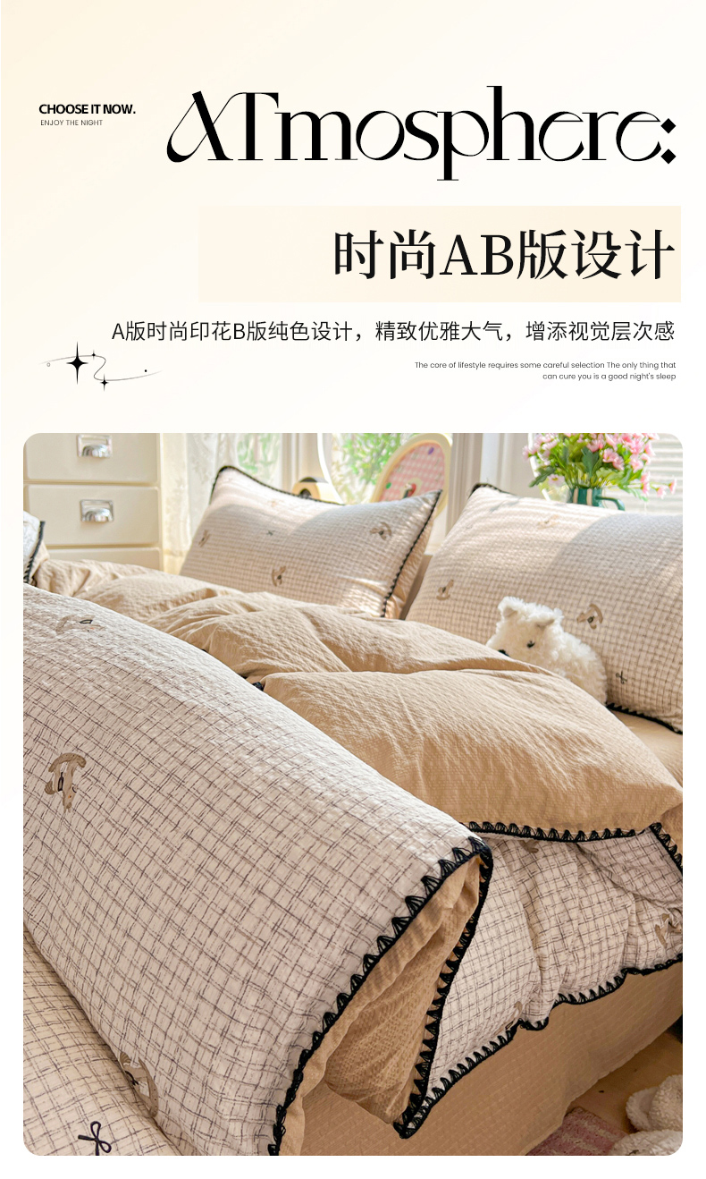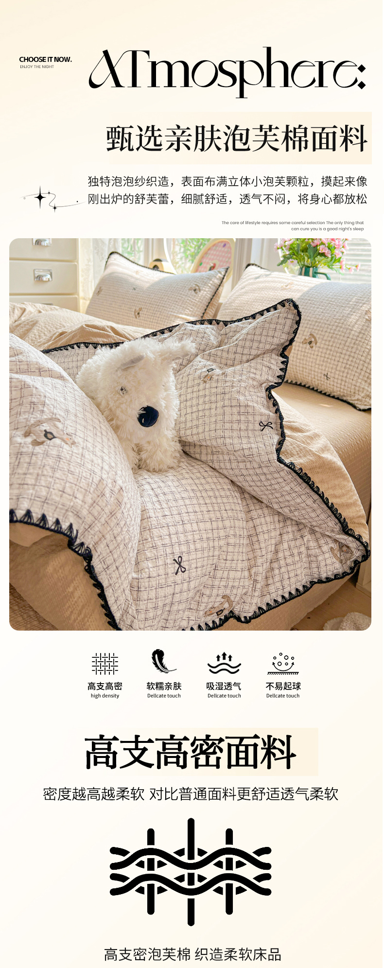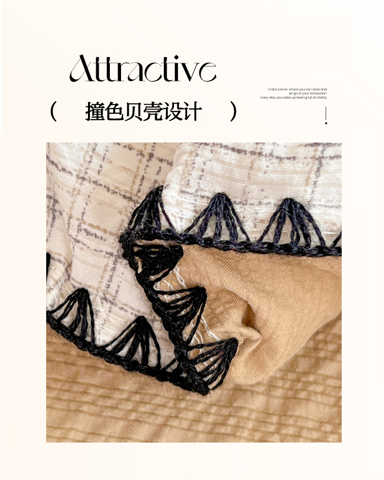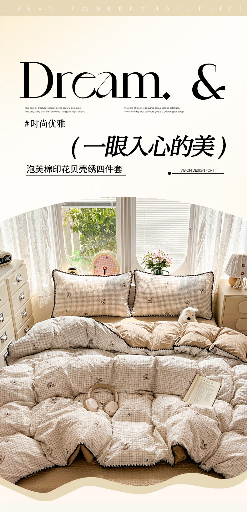 当前位置: 91家纺网 > 商品网购 > 床品套件 > 四件套 > 其它四件套 > 恒尚居 2026新款泡芙纱四件套贝壳绣边床盖套件单被套床单床笠 【细格木马】贝壳边