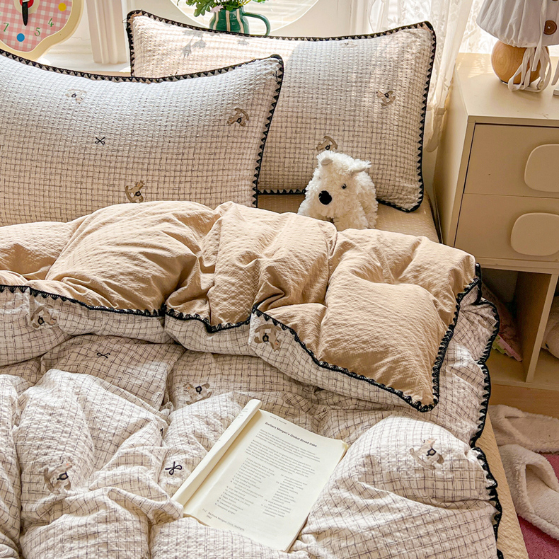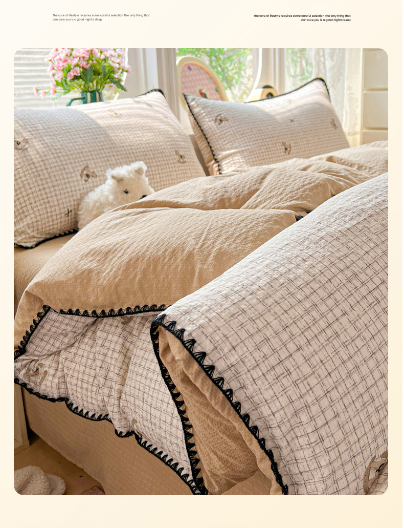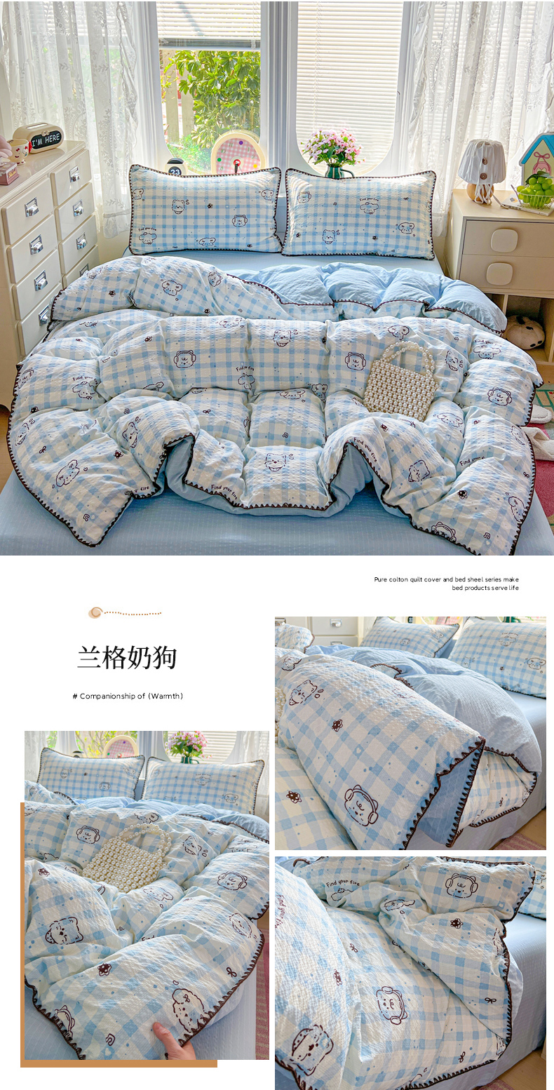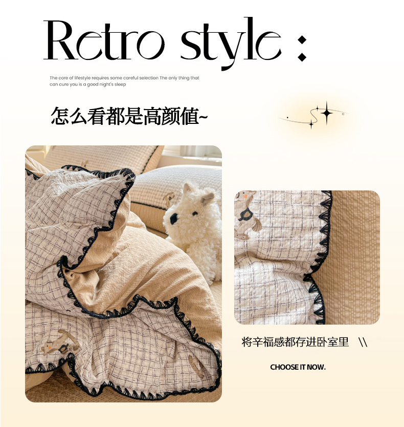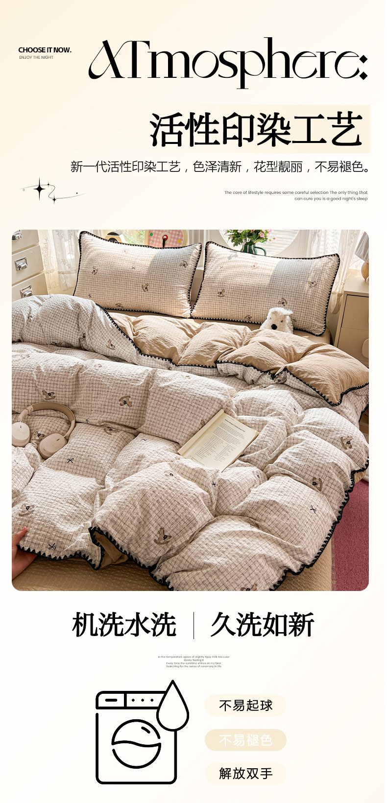 当前位置: 91家纺网 > 商品网购 > 床品套件 > 四件套 > 其它四件套 > 恒尚居 2026新款泡芙纱四件套贝壳绣边床盖套件单被套床单床笠 【细格木马】贝壳边