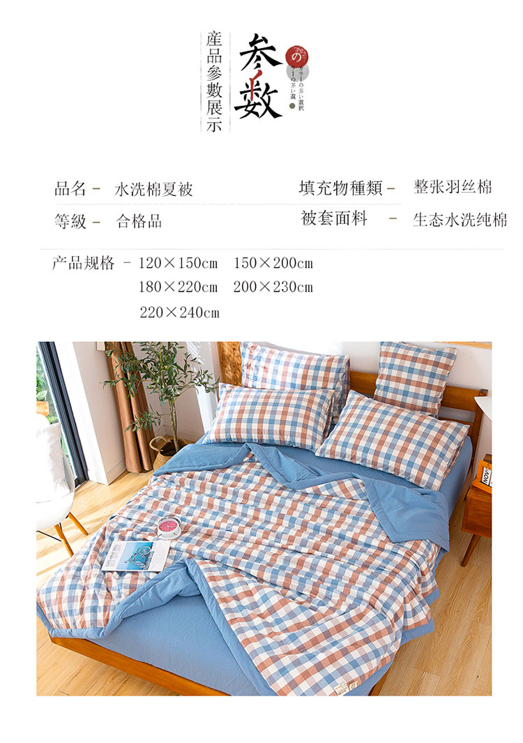 商品名称:天瑜家纺 2023新款全棉色织水洗棉夏被 蓝咖中格