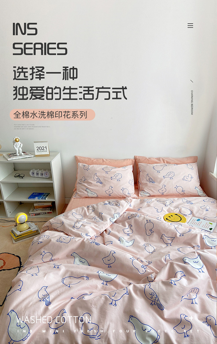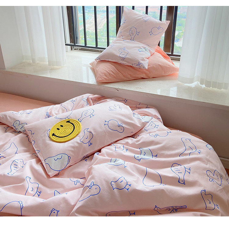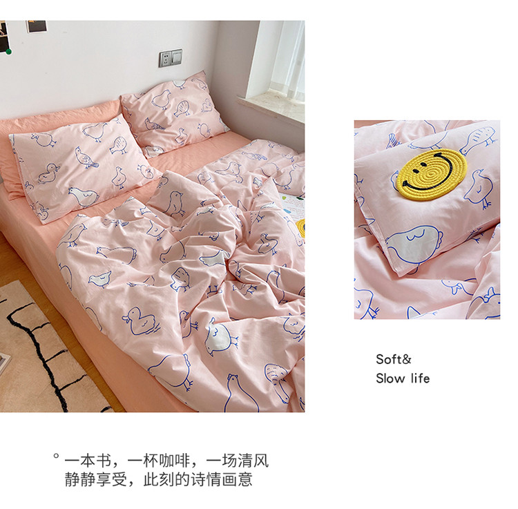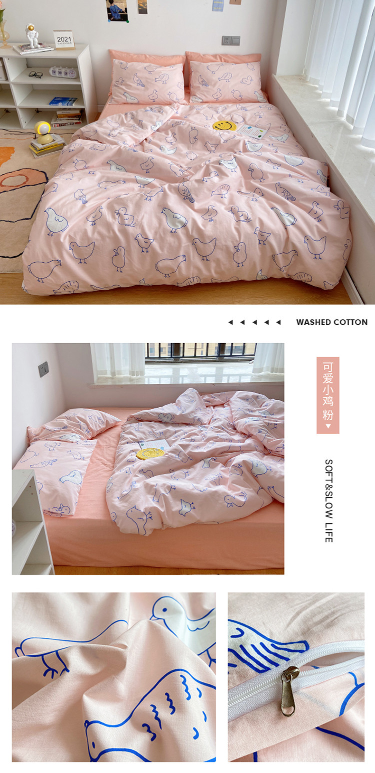 当前位置: 91家纺网 > 商品网购 > 床品套件 > 四件套 > 全棉普通四件套 > 尺素 纯棉ins印花水洗棉卡通可爱全棉被套纯色床单四件套 可爱小鸡粉