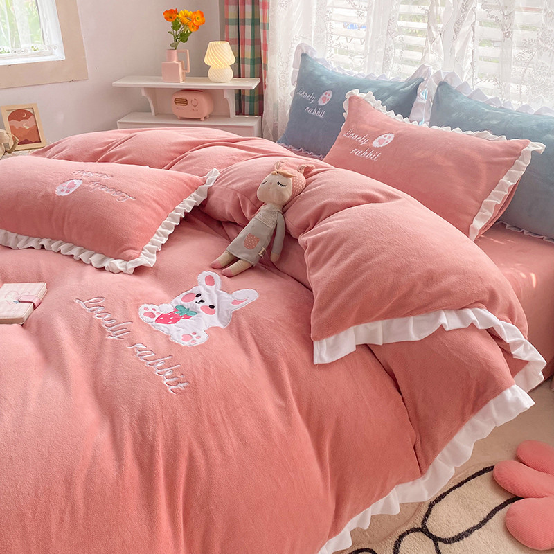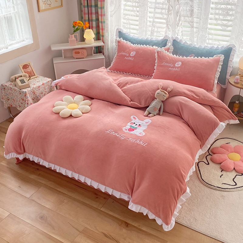 (总)二八年华 2025新款韩式花边款牛奶绒四件套,天蓝,豆沙,鹅黄,粉玉,水绿,鸢紫