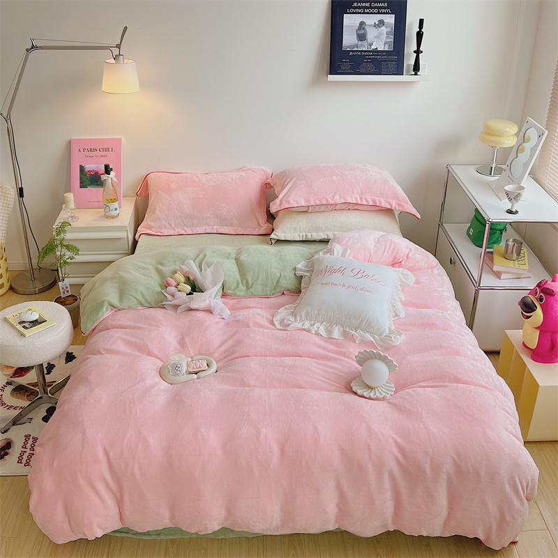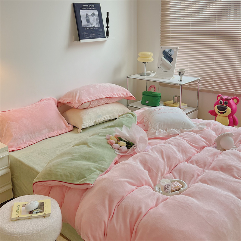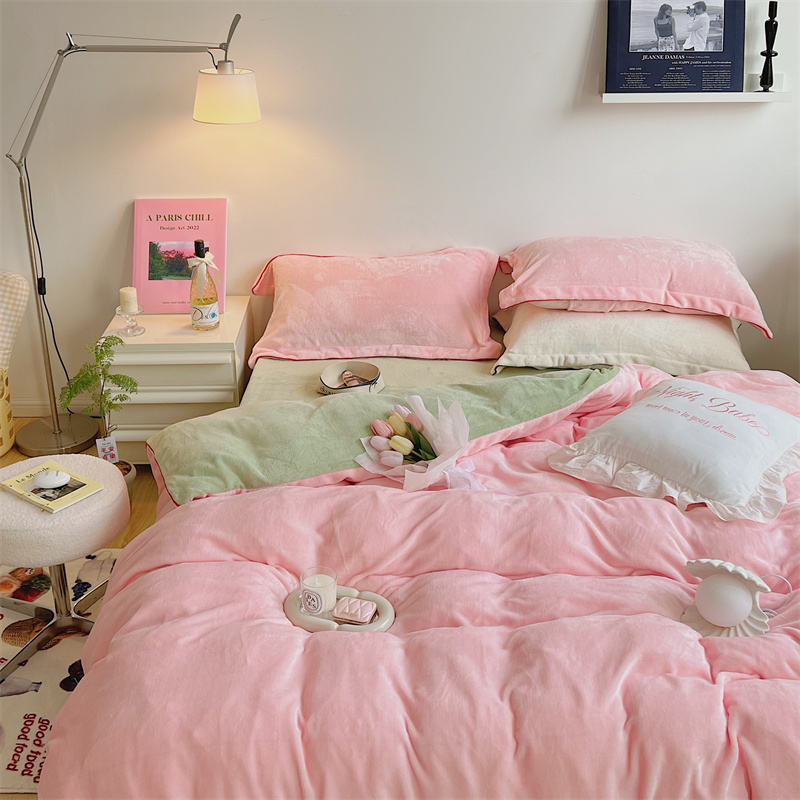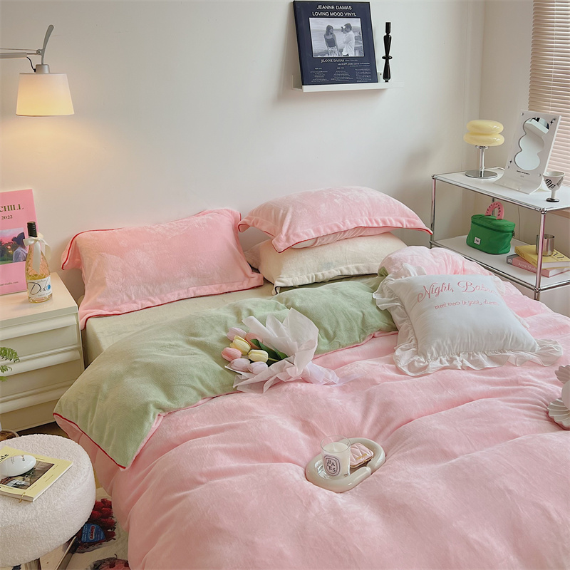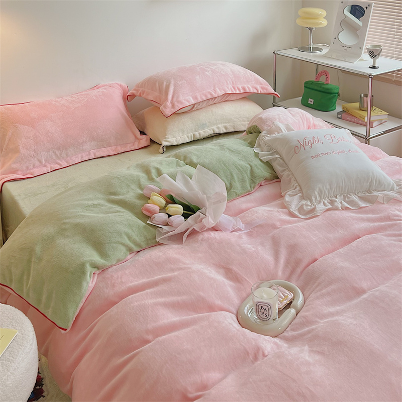 顾里家纺 新款Chic奶油嵌绳撞色牛奶绒四件套-第二组 奶油粉绿