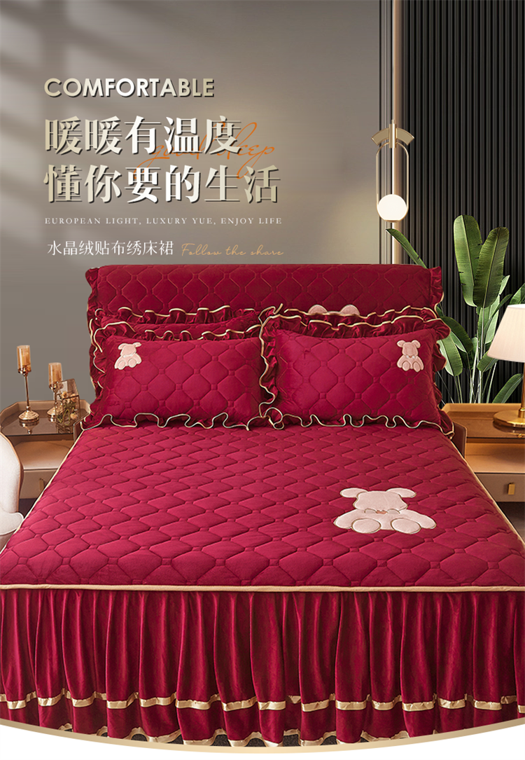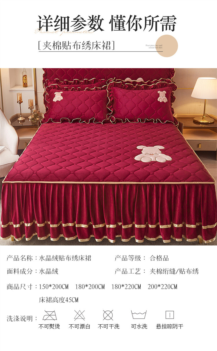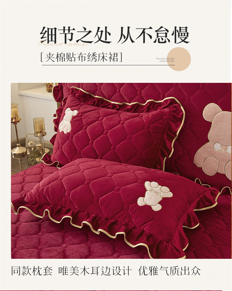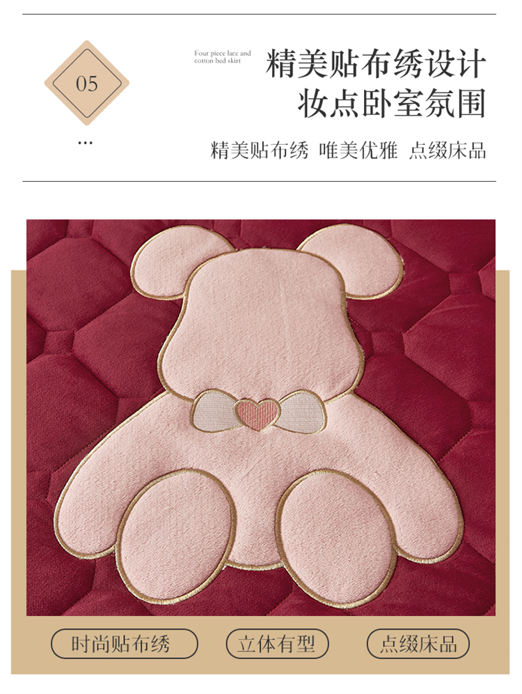 屹成 2024新款水晶绒夹棉床裙贴布绣款-小熊款 酒红