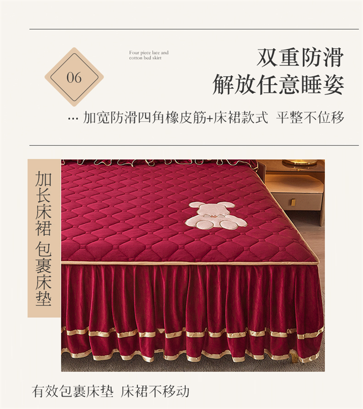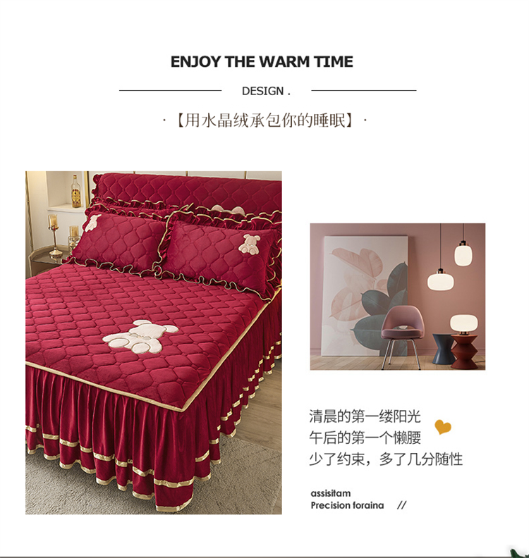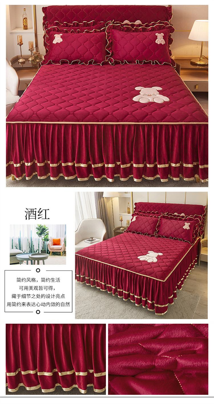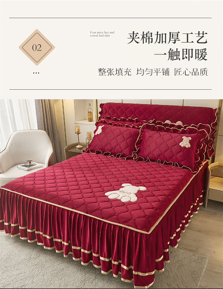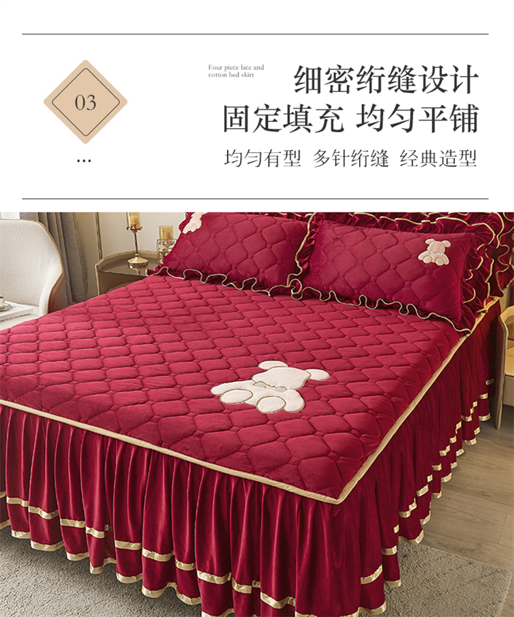 屹成 2024新款水晶绒夹棉床裙贴布绣款-小熊款 酒红