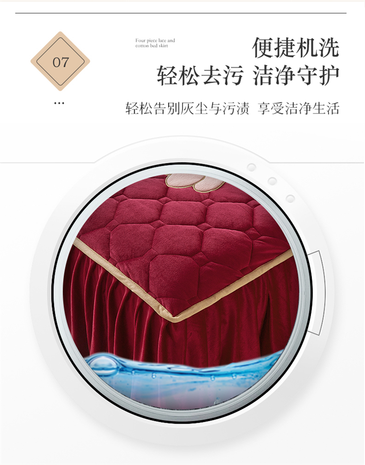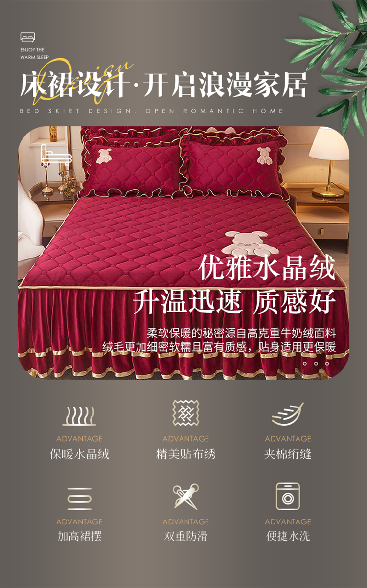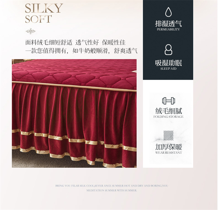 • 91家纺网 家纺一手货源 找家纺 (总)屹成家纺2025新款水晶绒夹棉绗缝蕾丝床裙三件套(塞纳河畔)床裙单件起售价不低于105元,大红,豆沙,翡翠绿,粉玉,橄榄绿,蔚蓝,银灰