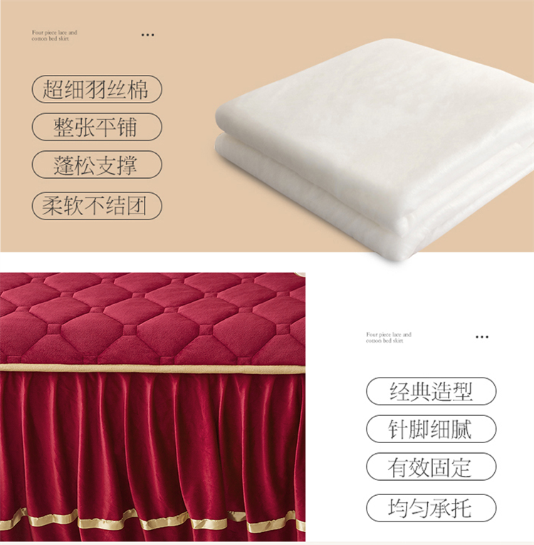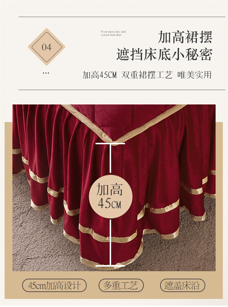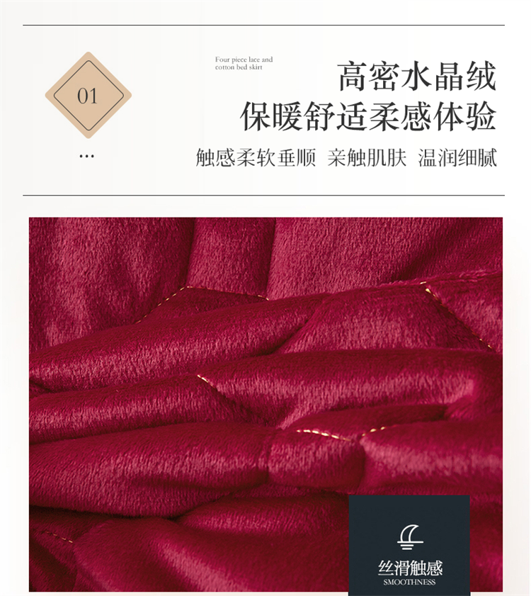 (总)屹成家纺2025新款水晶绒夹棉绗缝床裙四件套(塞纳河畔)四件套起售价不低于230元,大红,豆沙,翡翠绿,粉玉,橄榄绿,蔚蓝,银灰