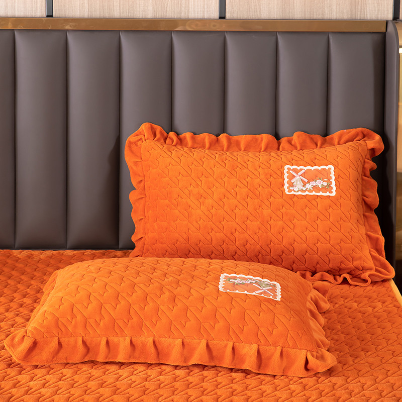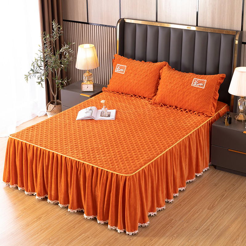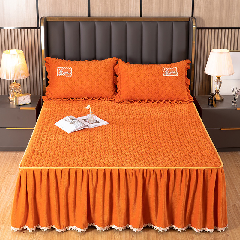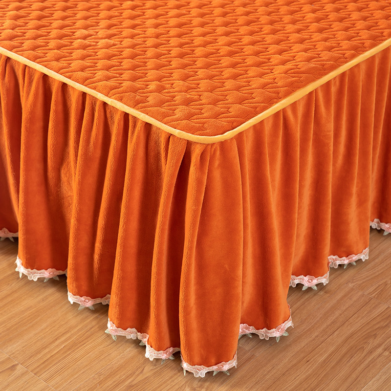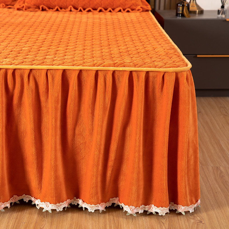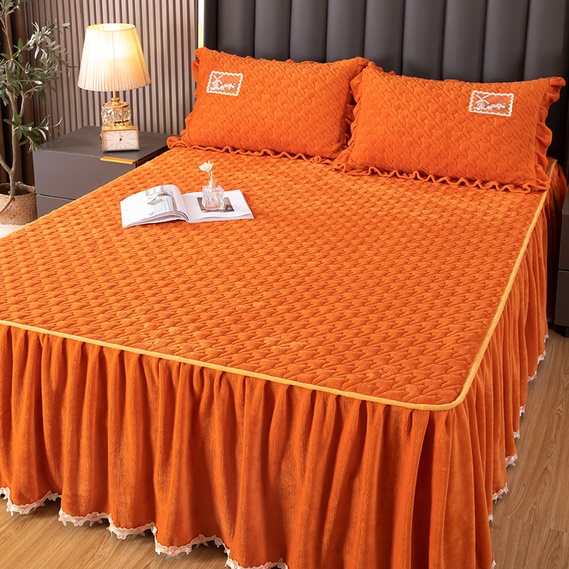 木兰花 牛奶绒夹棉纯色床裙水晶法莱绒三件套-国色天香-深橘