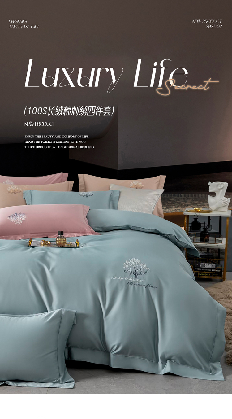 名品优仓 2023新款高支高密长绒棉刺绣款四件套-一树花开 一树花开-蓝