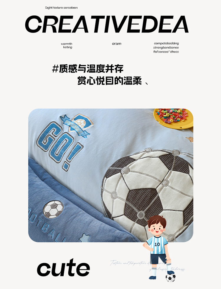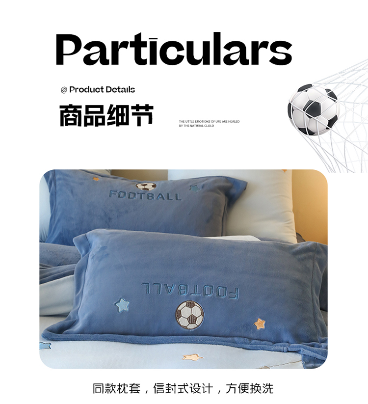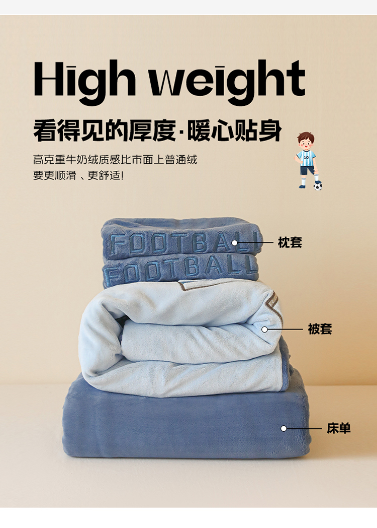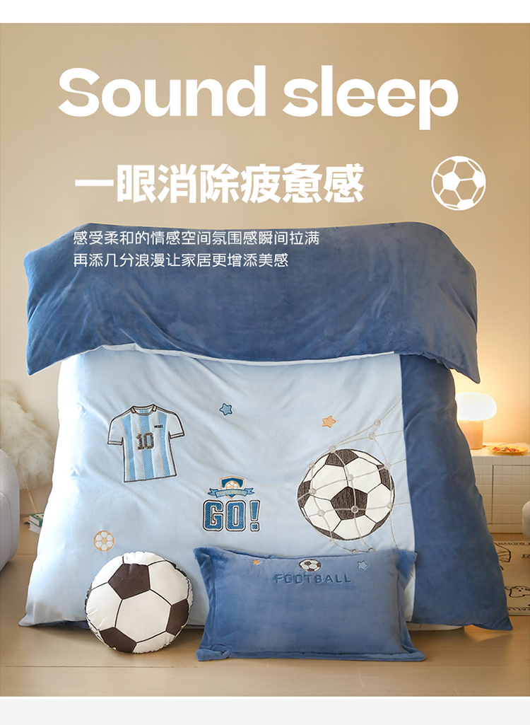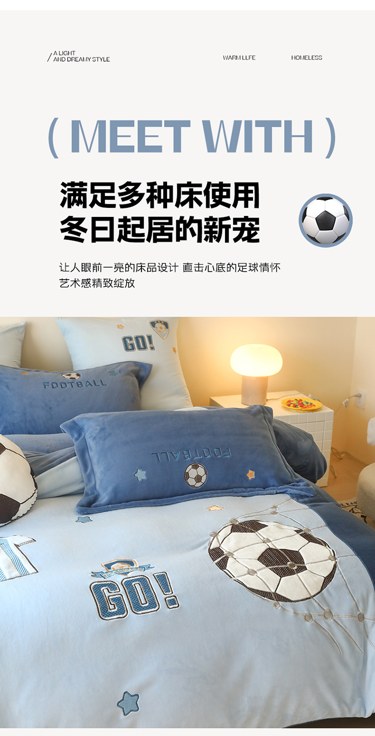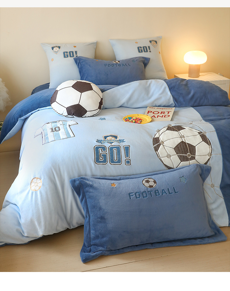 商品名称:(总)2025新款A类加厚足球篮球卡通贴布绣牛奶绒四件套冬季儿童三件套床单床笠保暖套件