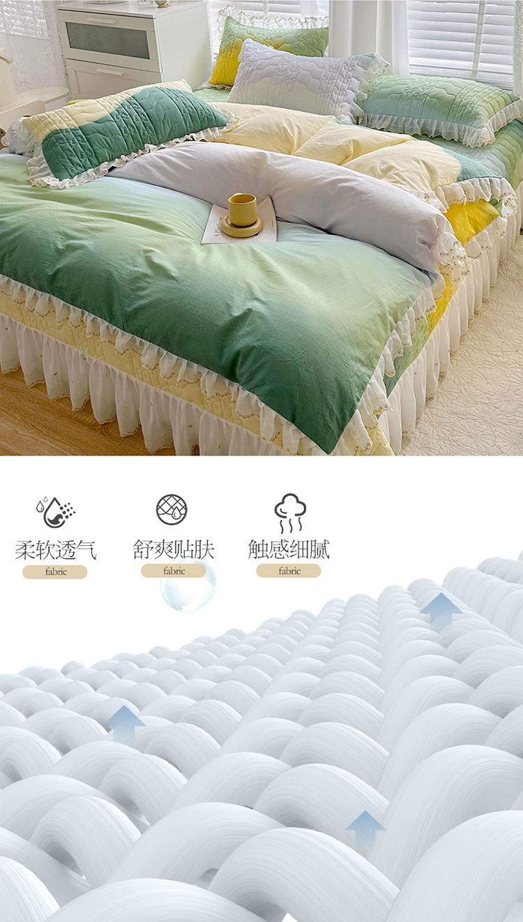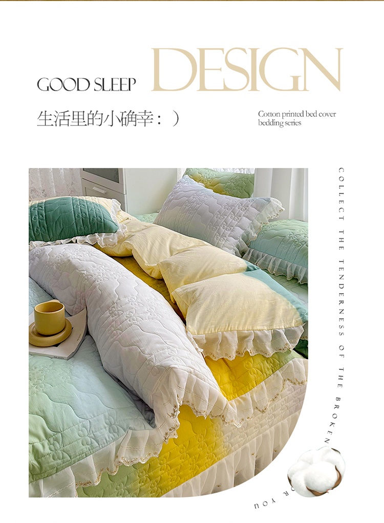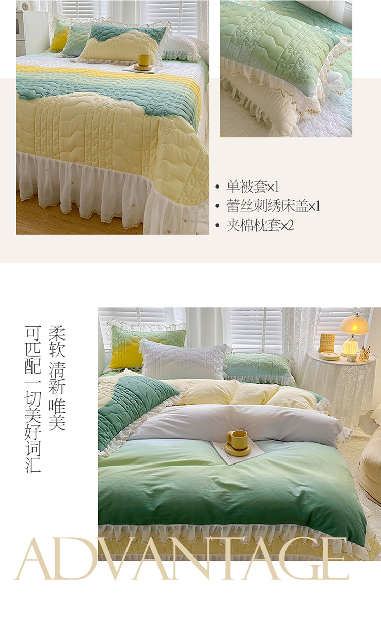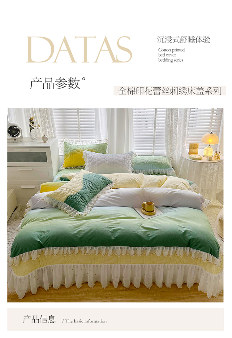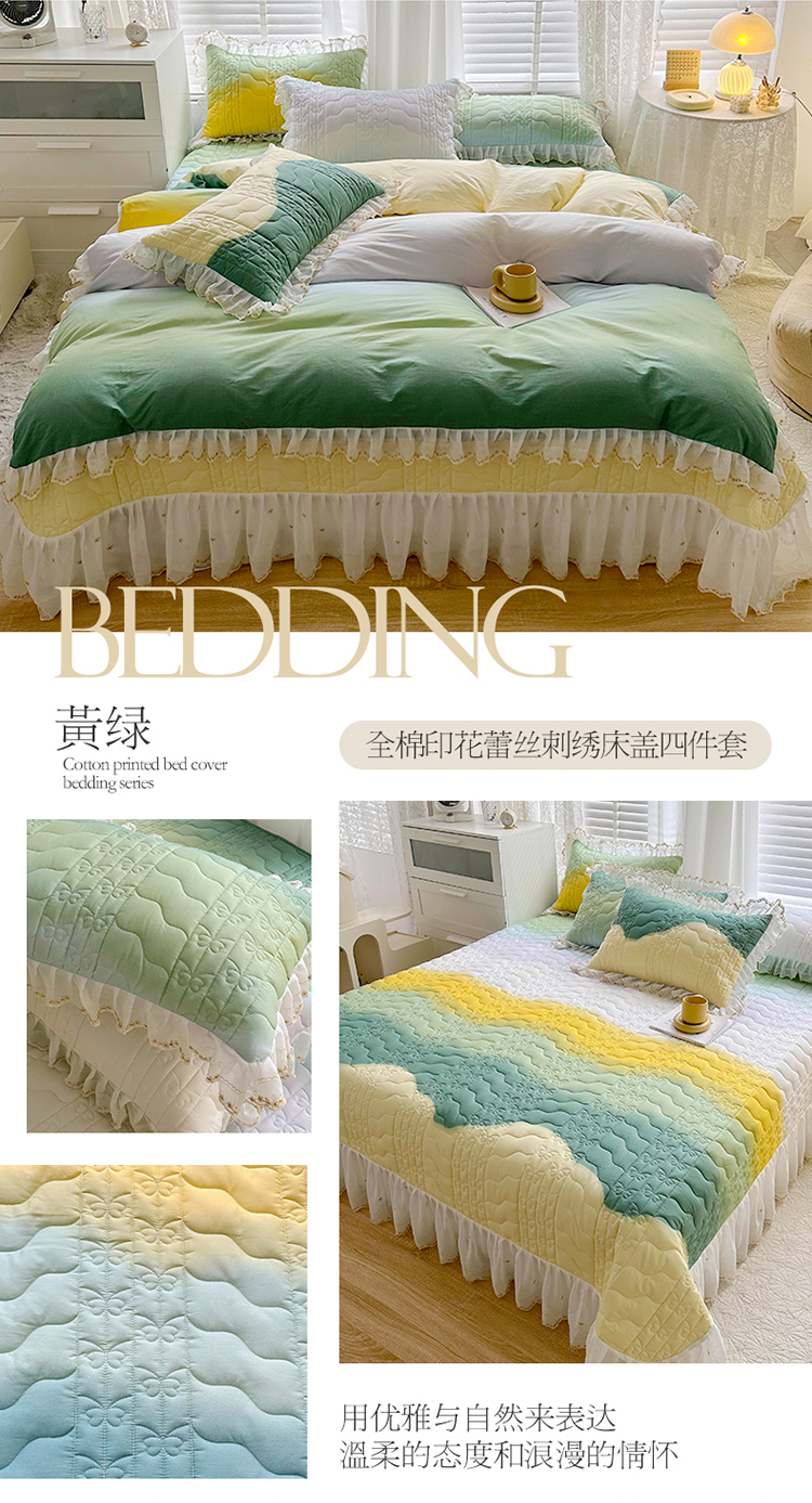 • 91家纺网 家纺一手货源 找家纺 宜凡 2023新款全棉蕾丝刺绣床盖四件套(单层被套) 黄绿