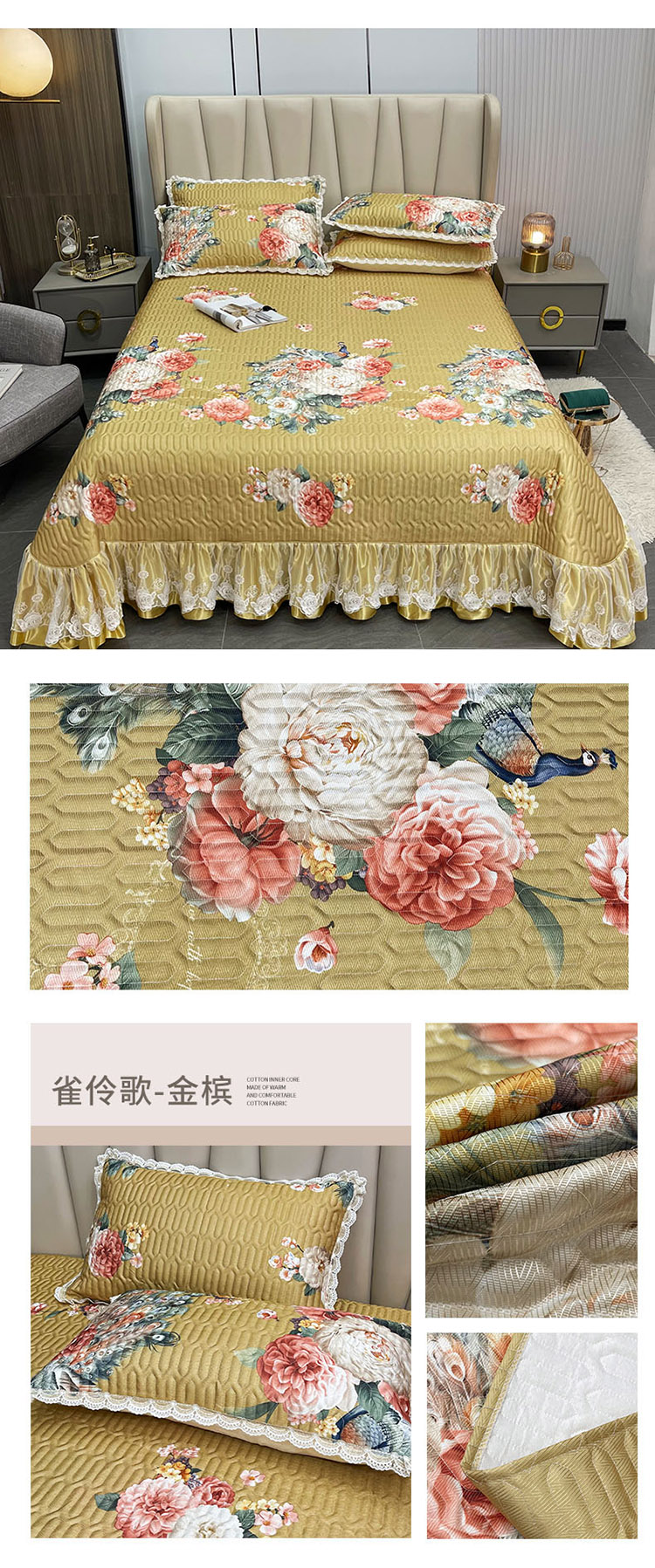 商品名称:恋尚 2023新款冰丝夹棉床盖款软凉席印花三件套 雀伶歌-金槟