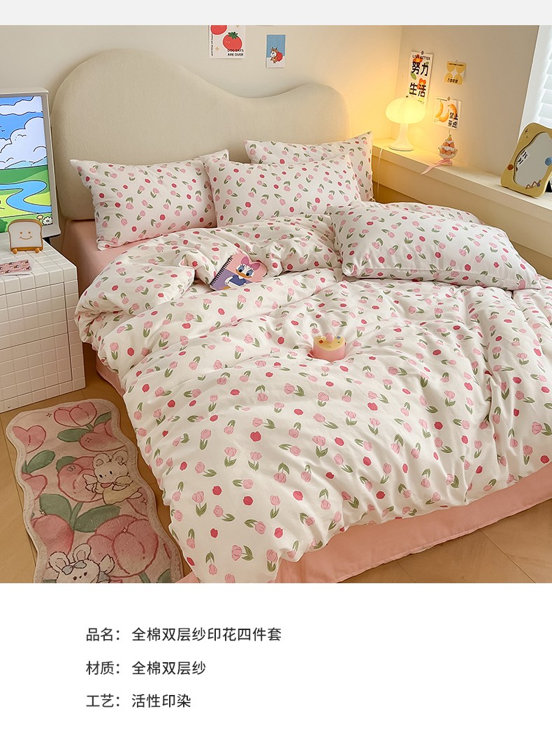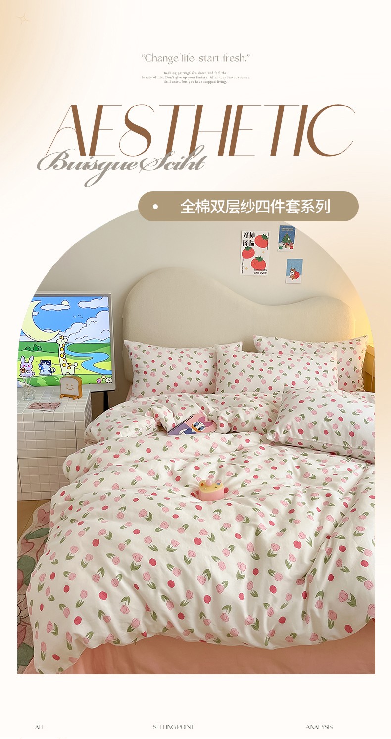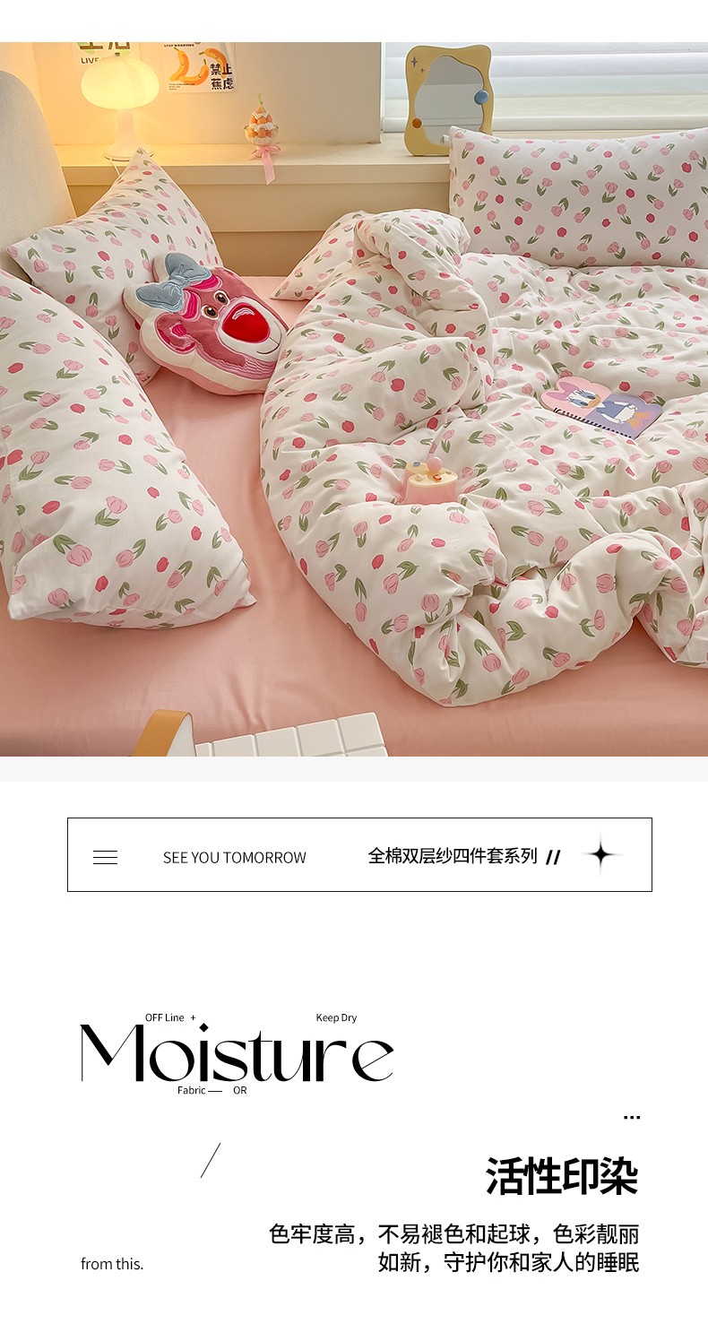 川悦生活 2023新款全棉双层纱印花四件套 蜜甜-粉