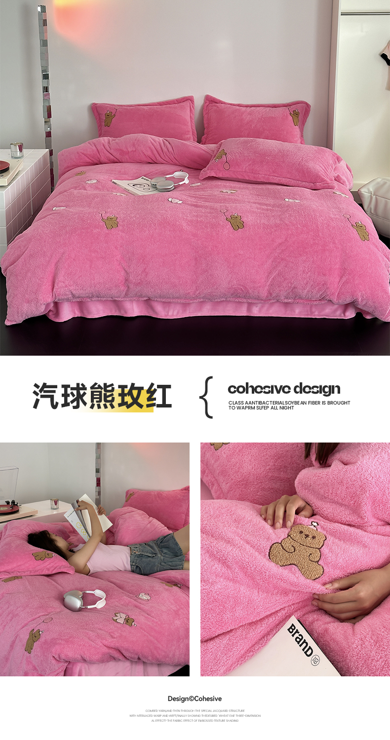 萝莉家纺 2023新款冬季加厚软绵绵的泰迪绒美丽绒毛巾绣牛奶绒四件套 汽球熊玫红