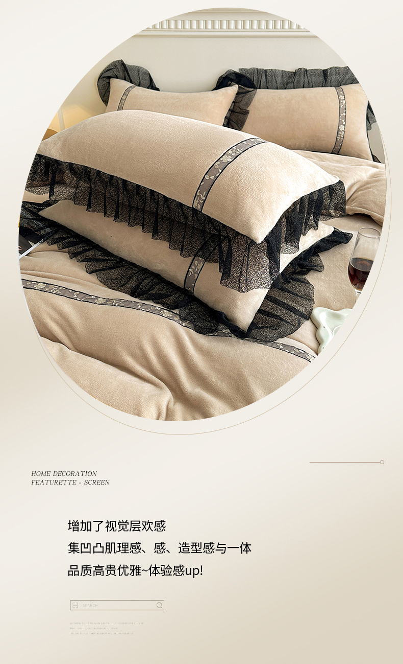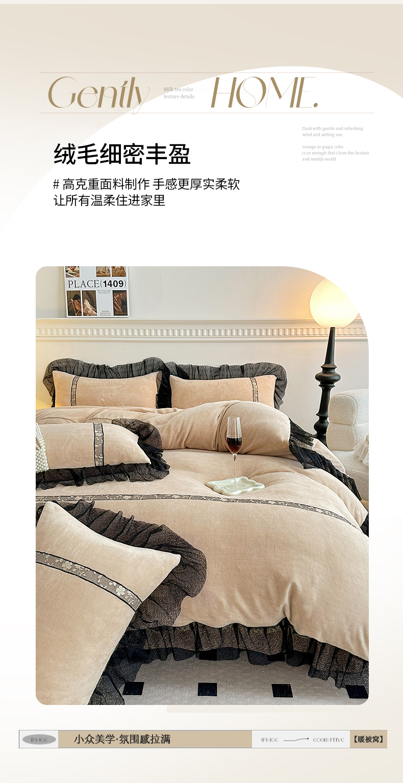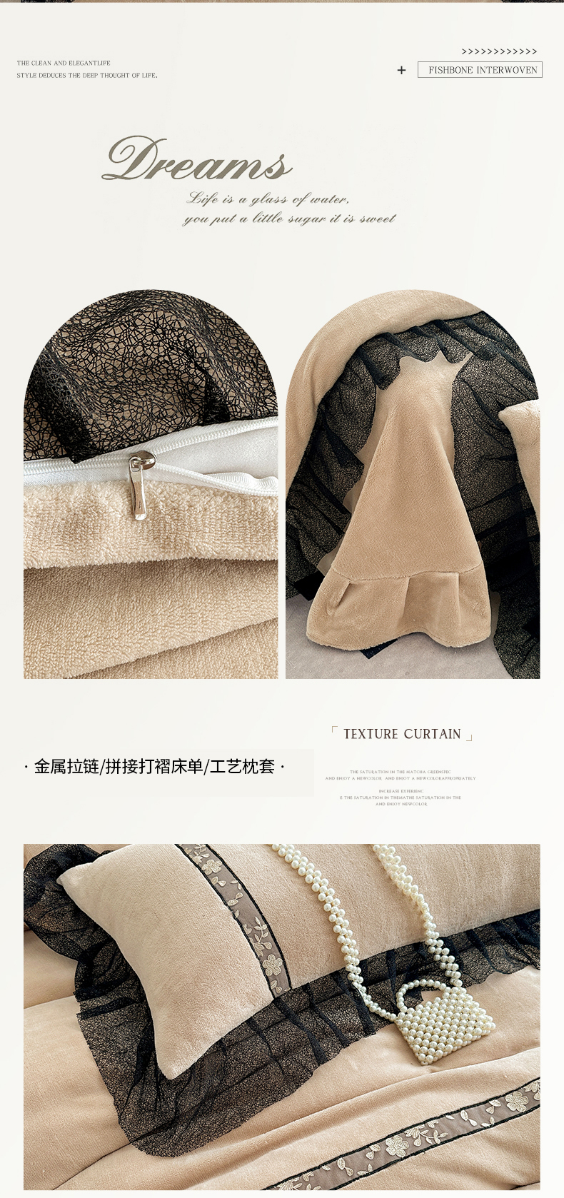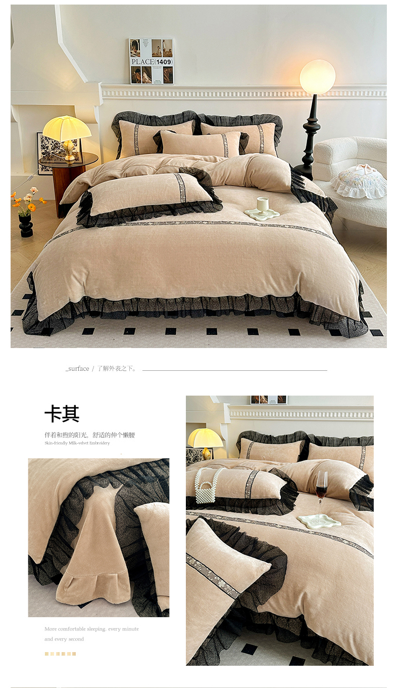 商品名称:其奥 2023新款法式大花边轻奢风纯色加厚牛奶绒四件套 卡其