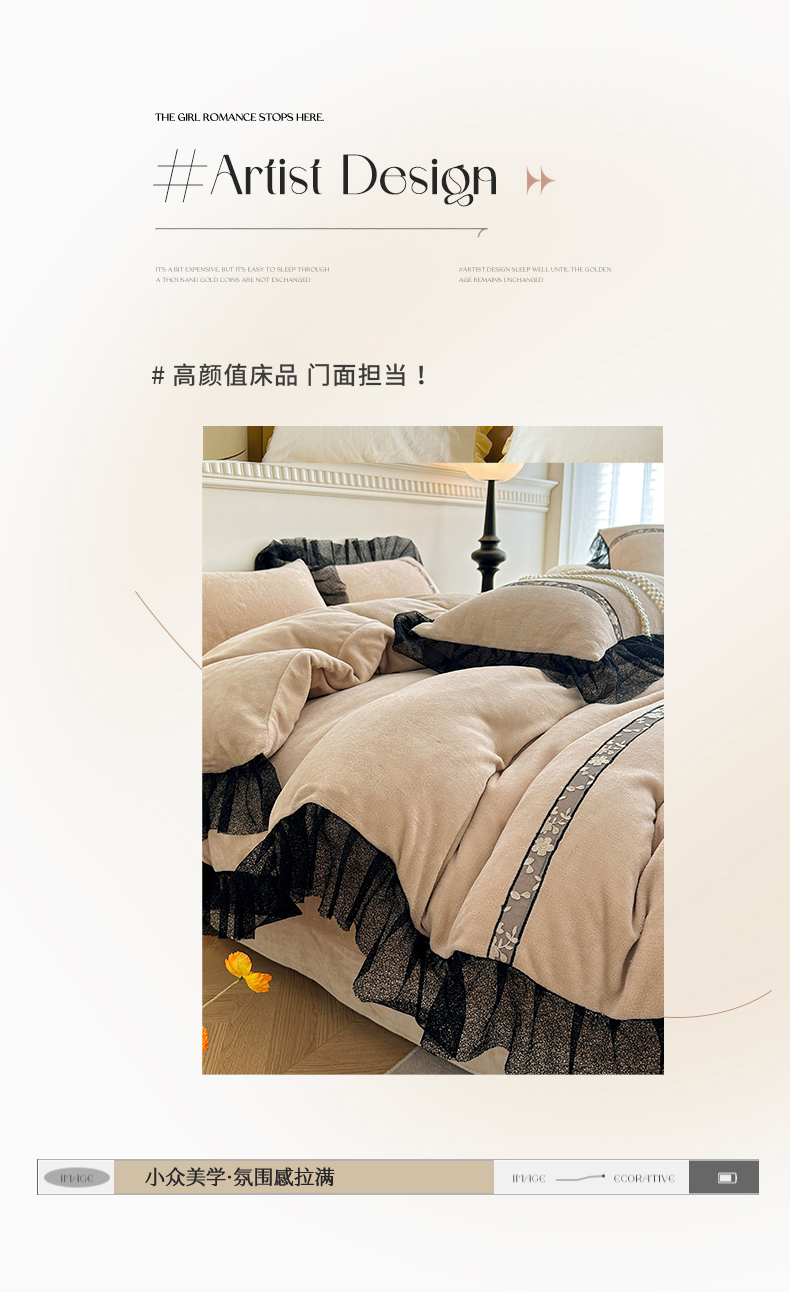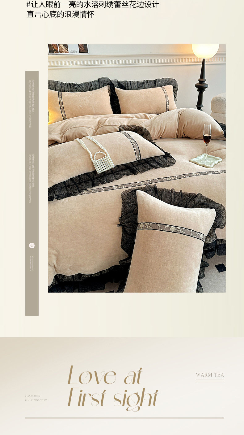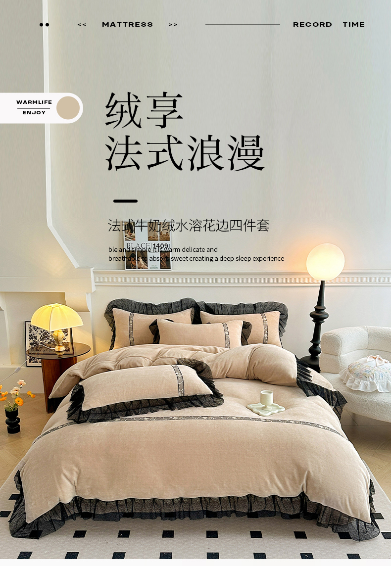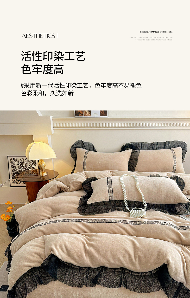 商品名称:其奥 2023新款法式大花边轻奢风纯色加厚牛奶绒四件套 卡其