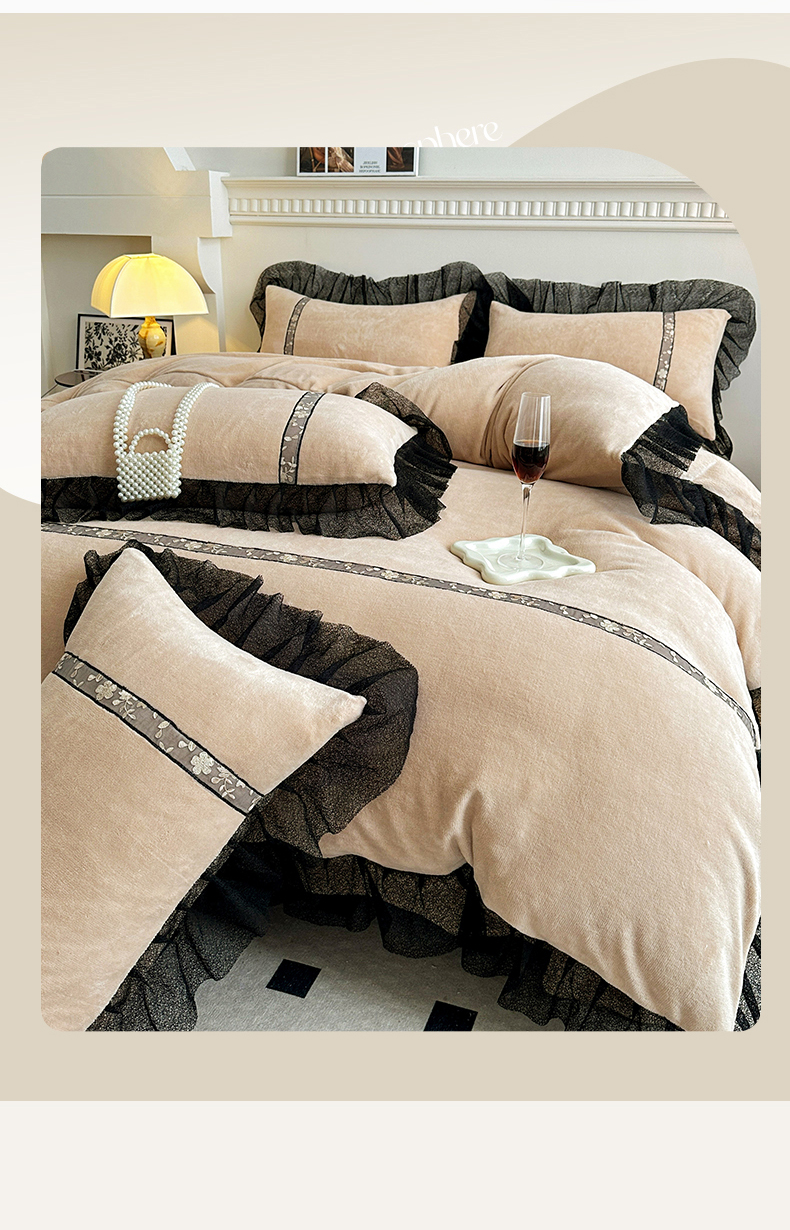 其奥 2023新款法式大花边轻奢风纯色加厚牛奶绒四件套 卡其