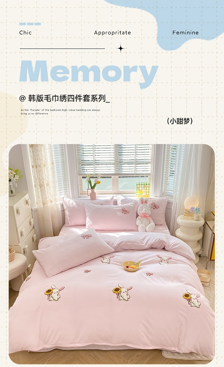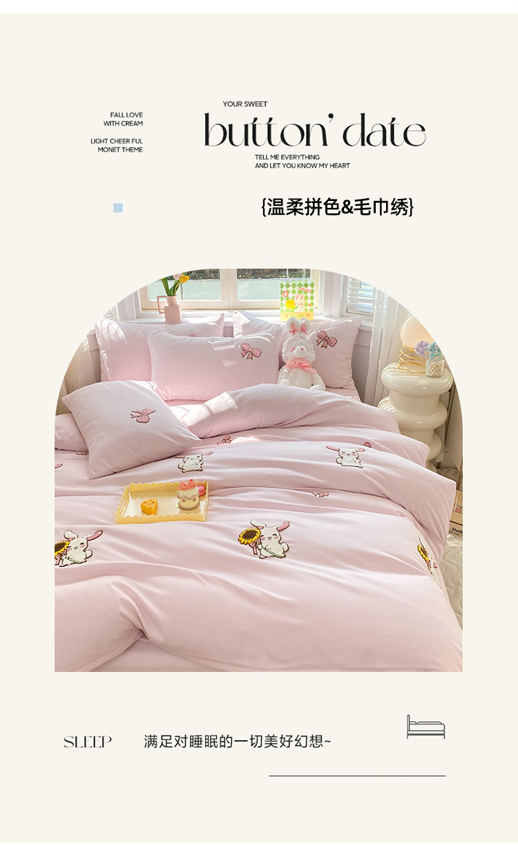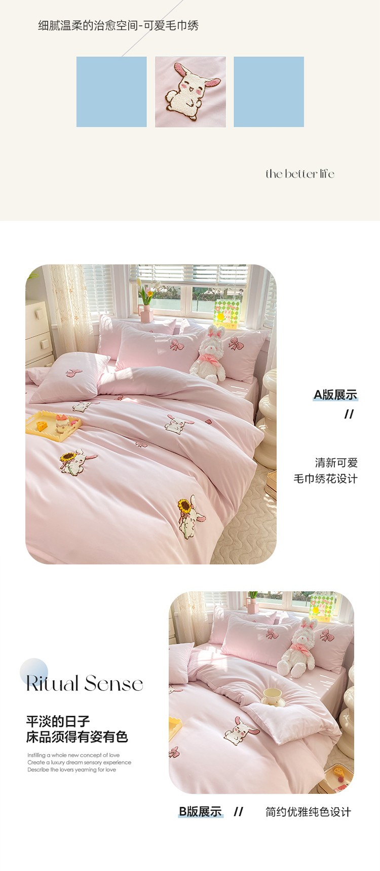 欧冠 2023新款秋冬保暖专版水洗棉麻毛巾绣四件套 兔宝贝-粉