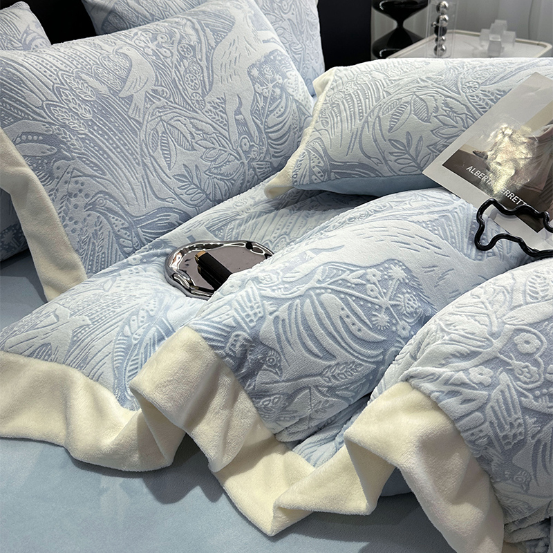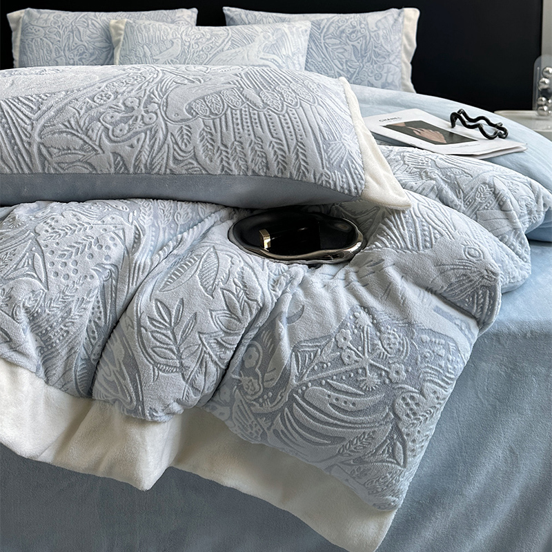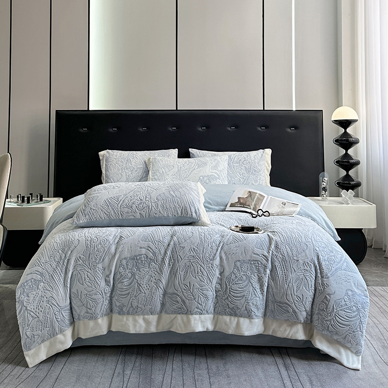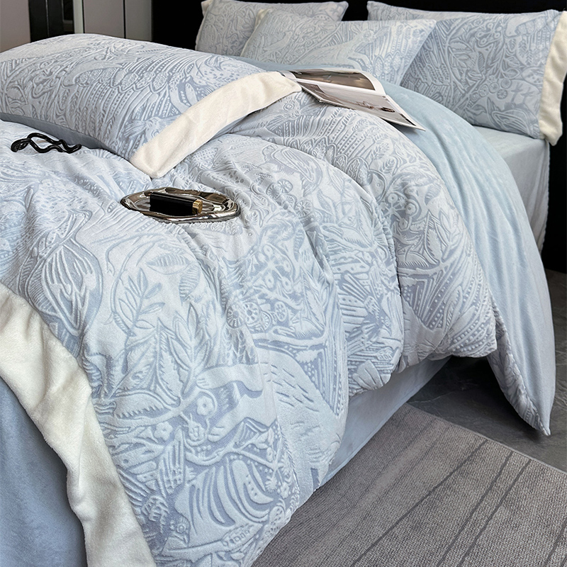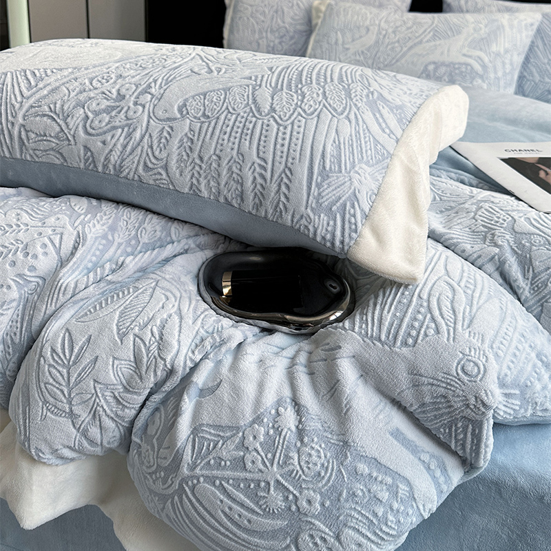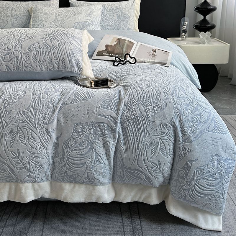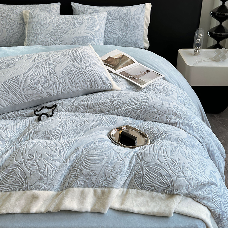 床品套件 > 宅家居 2023新款高奢加厚A类高克重浮雕花绒剪花烂花牛奶绒四件套 布鲁斯-浅蓝
