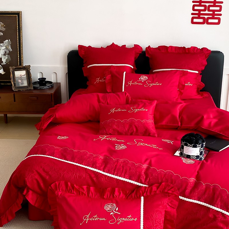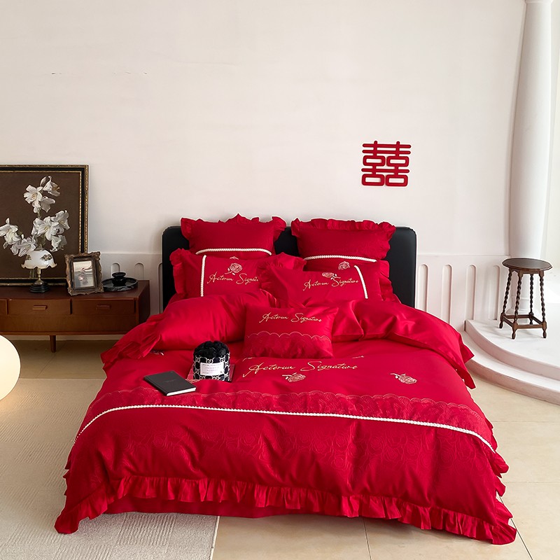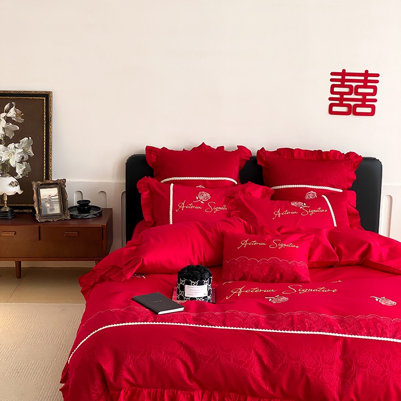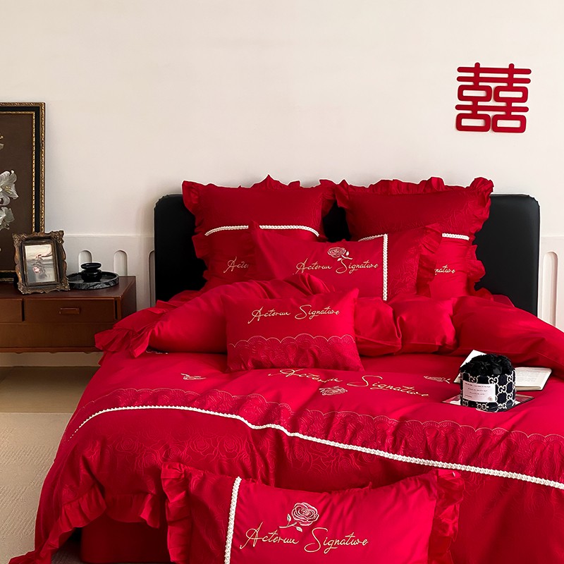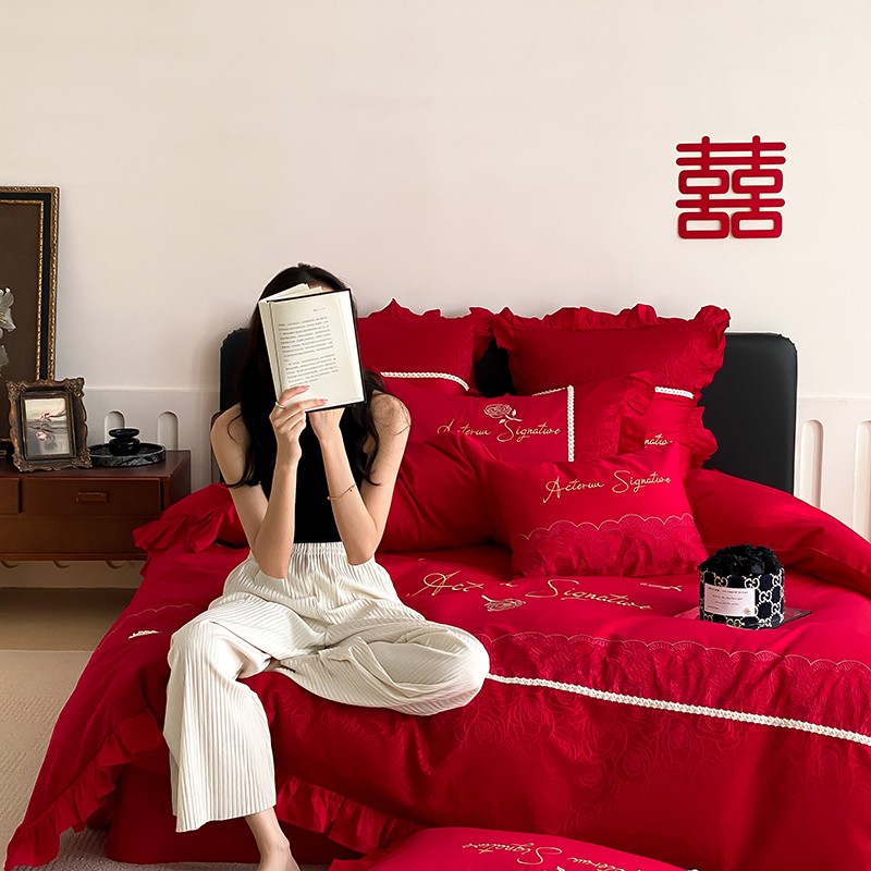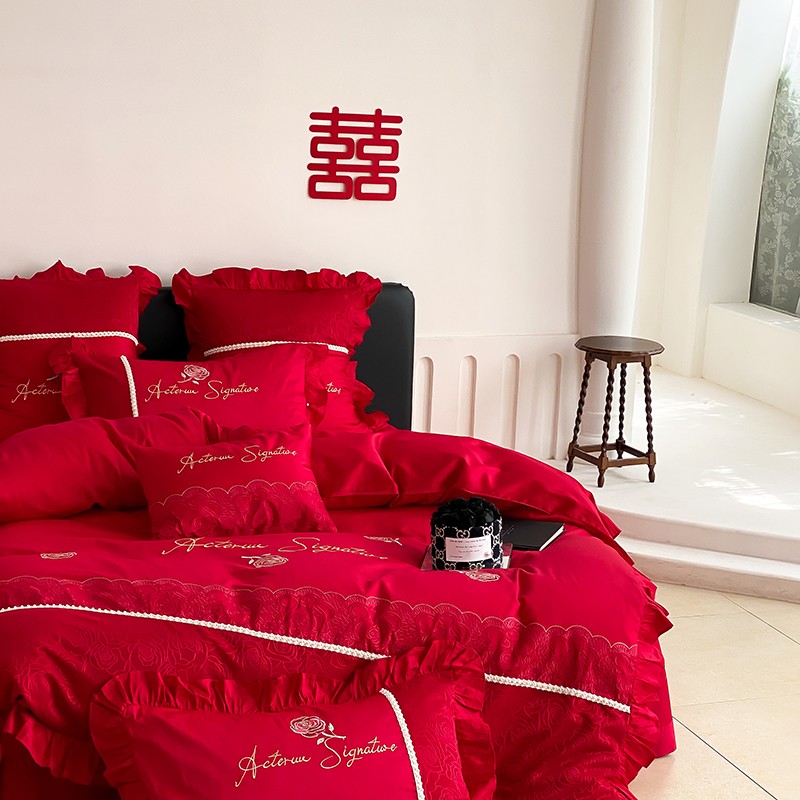 (总)用心 2025年新款牛奶绒宝宝绒花边贴布婚庆四件套多件套,大喜,喜结良缘,喜樂,永结同心