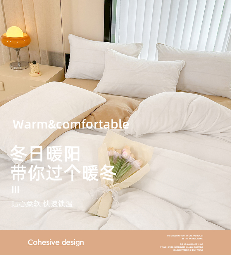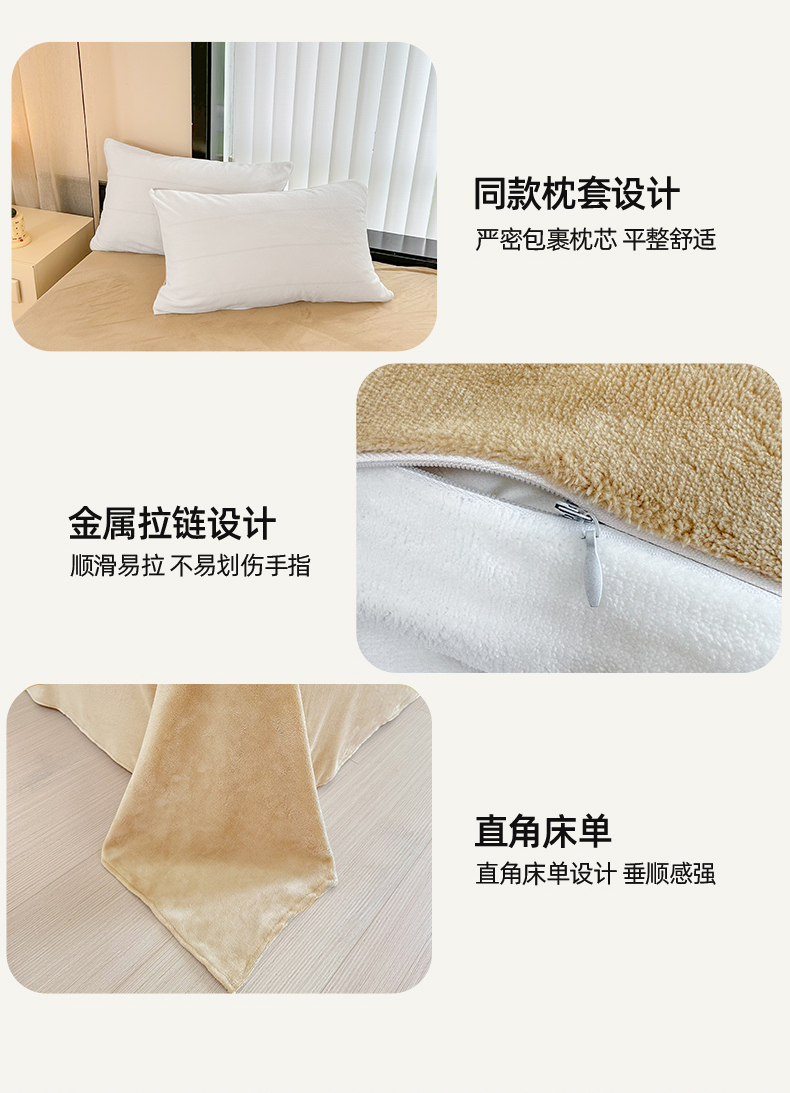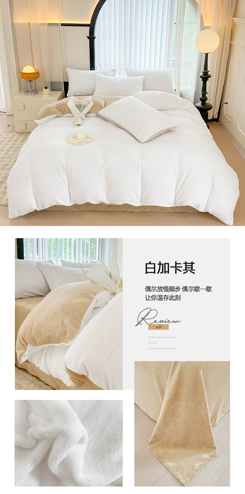 商品名称:迷仙巢家纺 2023新款双拼牛奶绒四件套 白加卡其