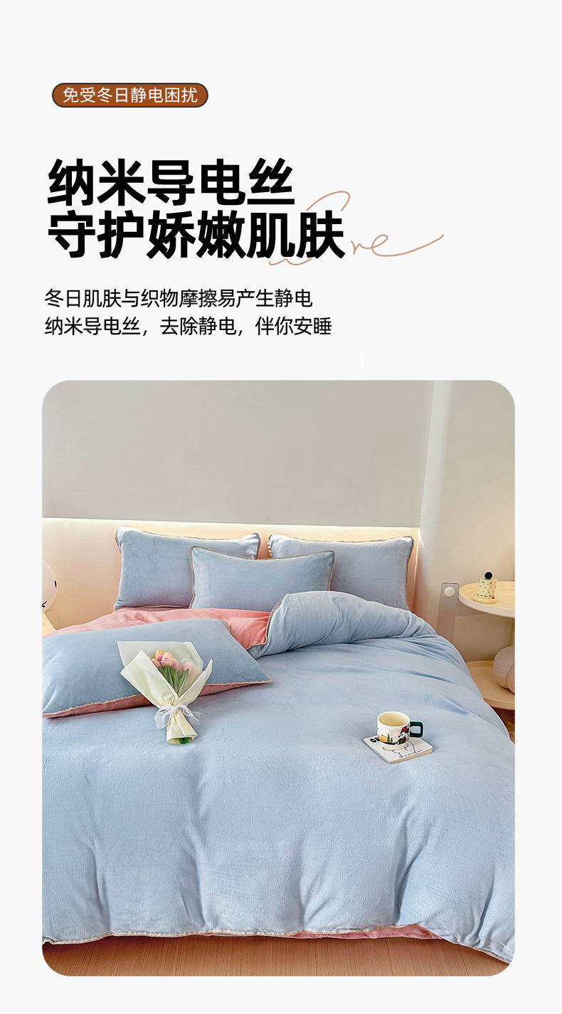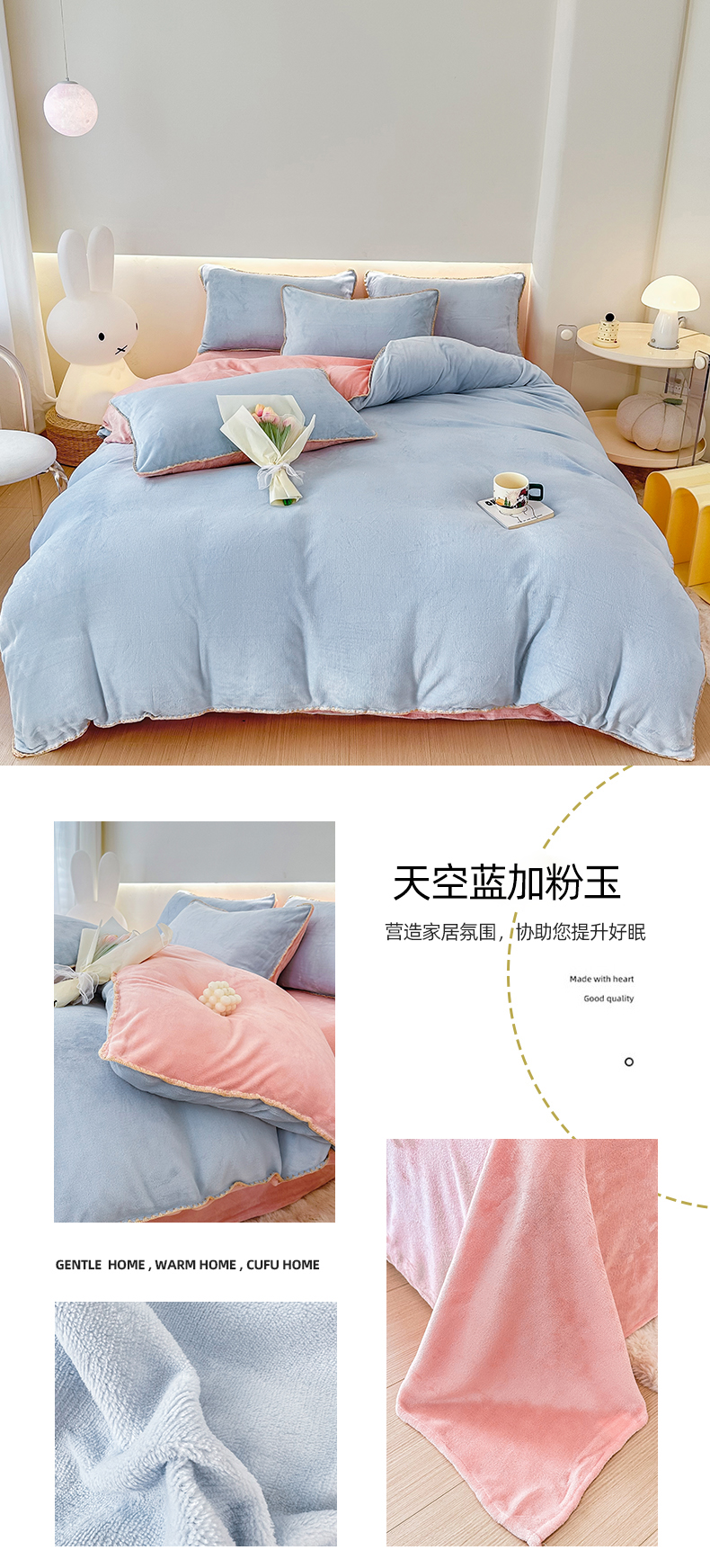 商品名称:迷仙巢家纺 2023新款贝壳绒四件套 天空蓝加粉玉