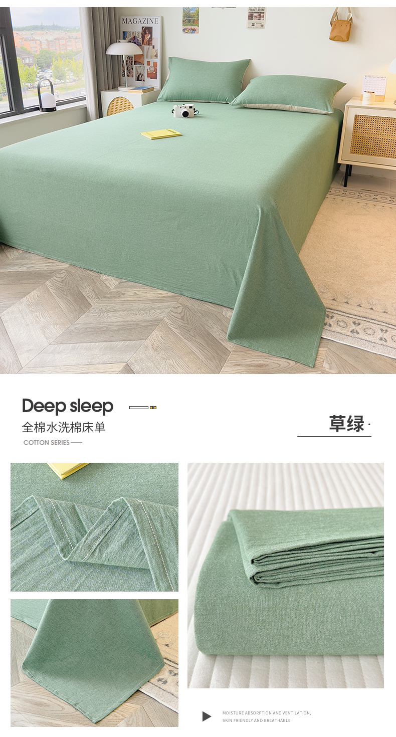 • 91家纺网 家纺一手货源 找家纺 芃成家纺 2023新款全棉水洗棉床单 草绿
