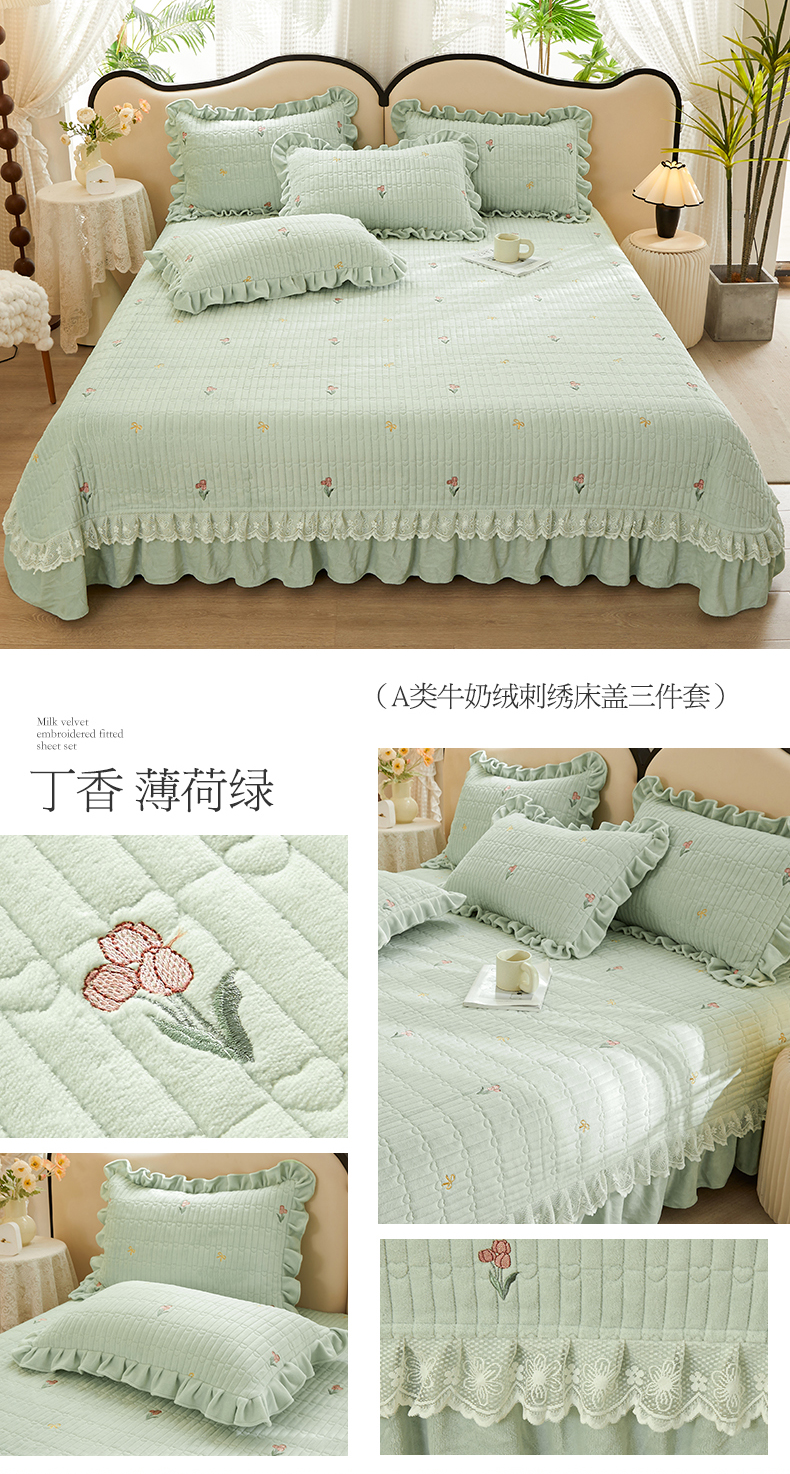 商品名称:宜凡 2023新款牛奶绒夹棉绗缝绣花床盖三件套 丁香-薄荷绿
