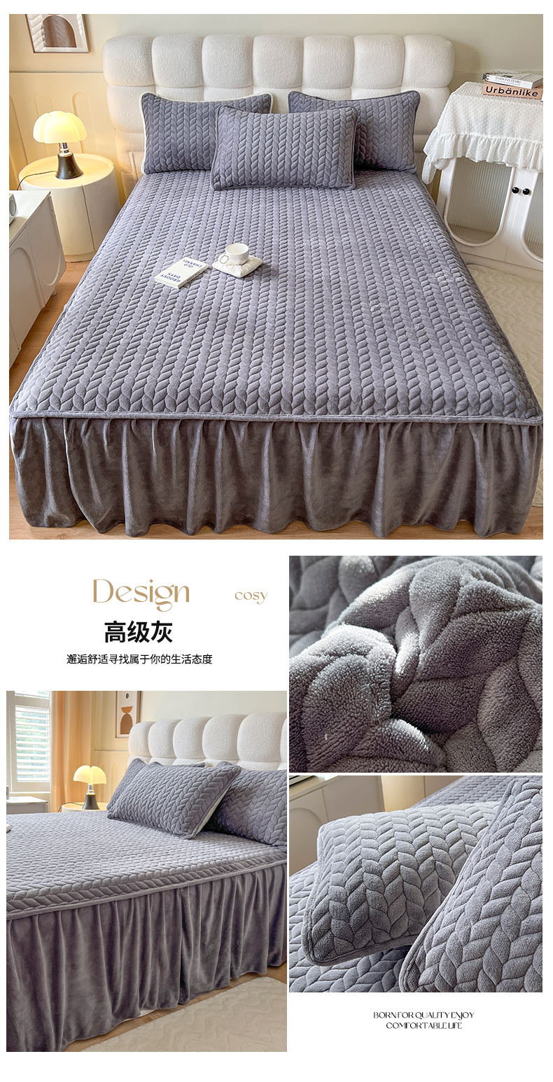 • 91家纺网 家纺一手货源 找家纺 格真 2025新款高克重牛奶绒夹棉床裙三件套(裙边高度45公分) 灰