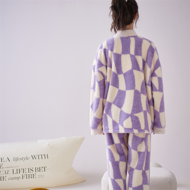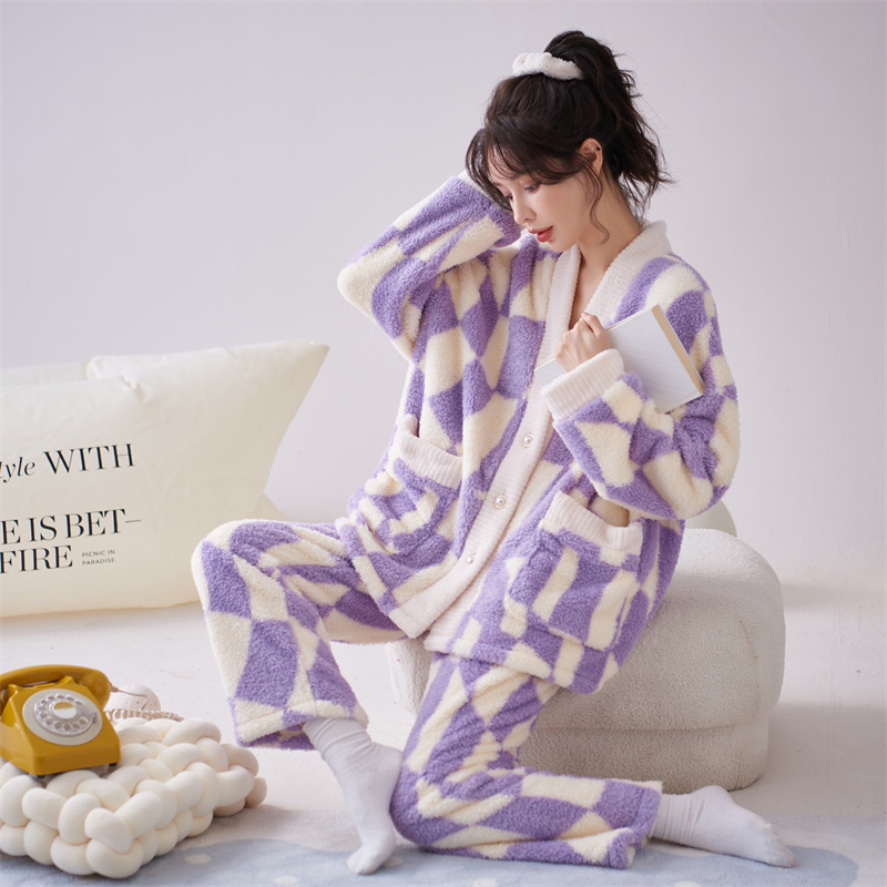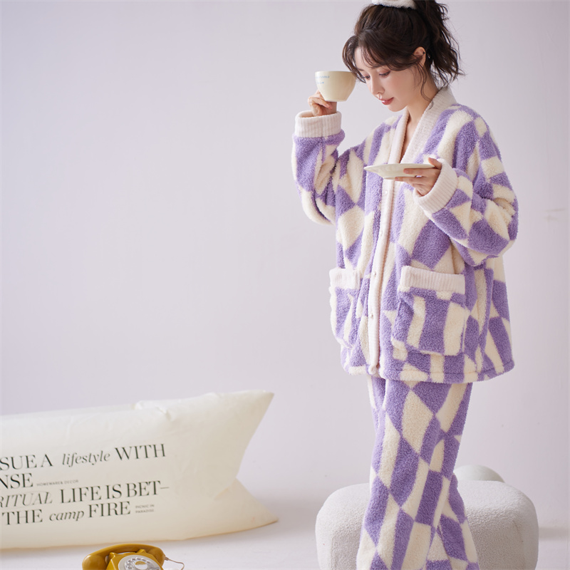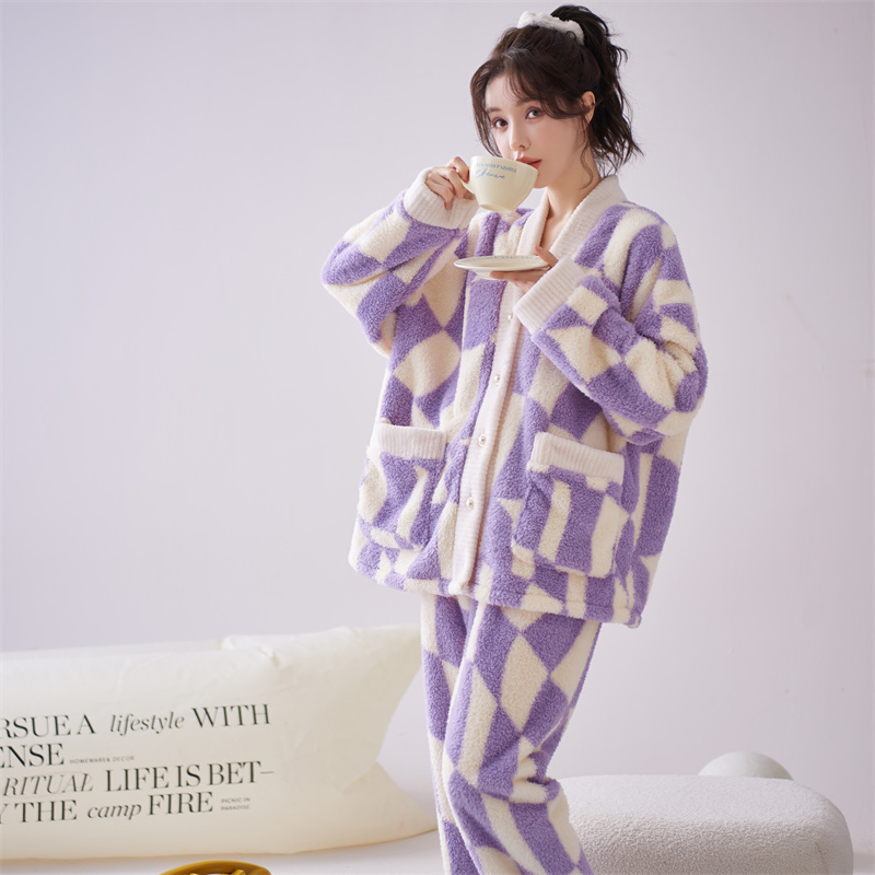 (总)洛兰沙家居馆 2025新款三层保暖女士秋冬家居服翻领长袖长裤套装简约宽松空气棉睡衣软糯,女士保暖千禧格套装-粉色,女士保暖千禧格套装-暮光蓝,女士保暖千禧格套装-奶油黄,女士保暖千禧格套装-紫色,组合图仅供展示不可下单