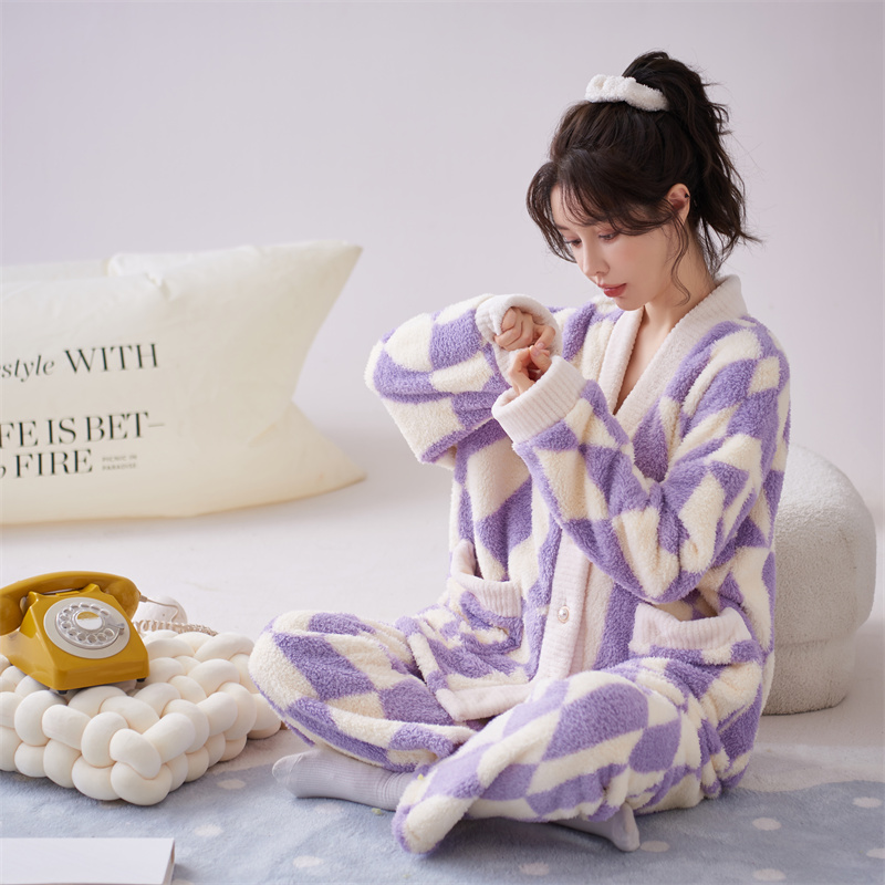 (总)洛兰沙家居馆 2024新款睡衣女秋冬季素色三层夹棉珊瑚绒加厚保暖两件套女士可外穿加绒家居服,紫色,咖色,橘色,绿色,蓝色,米色