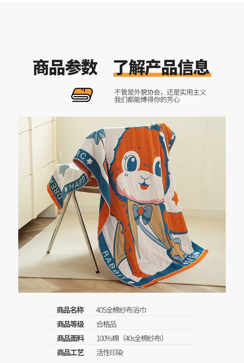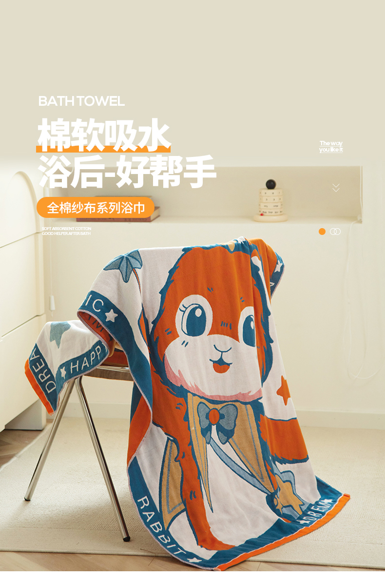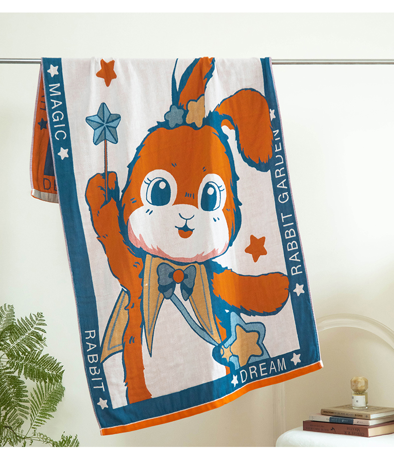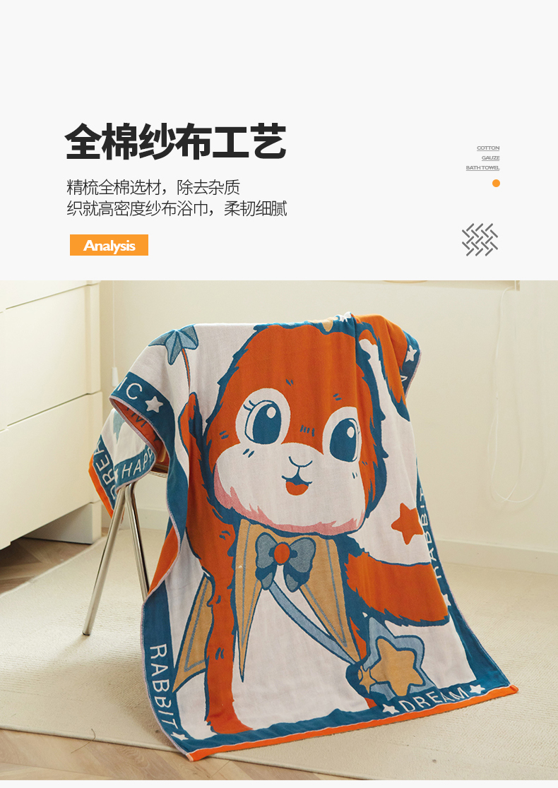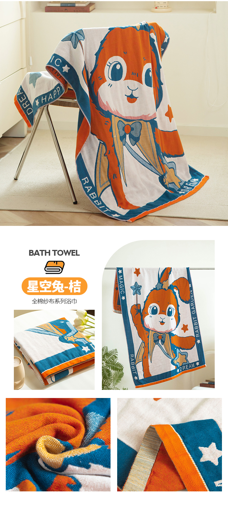 当前位置: 91家纺网 > 商品网购 > 居家日用 > 毛巾/浴巾/浴袍 > 浴巾 > 雯雨家纺 2023新款全棉卡通系列纱布浴巾 星空兔-桔
