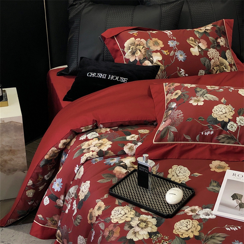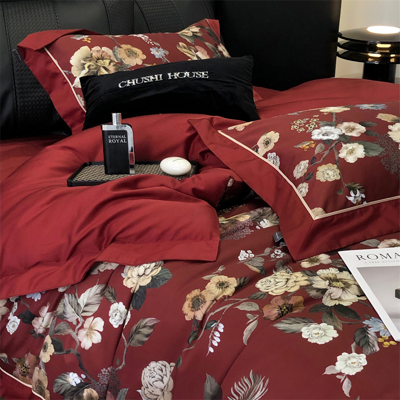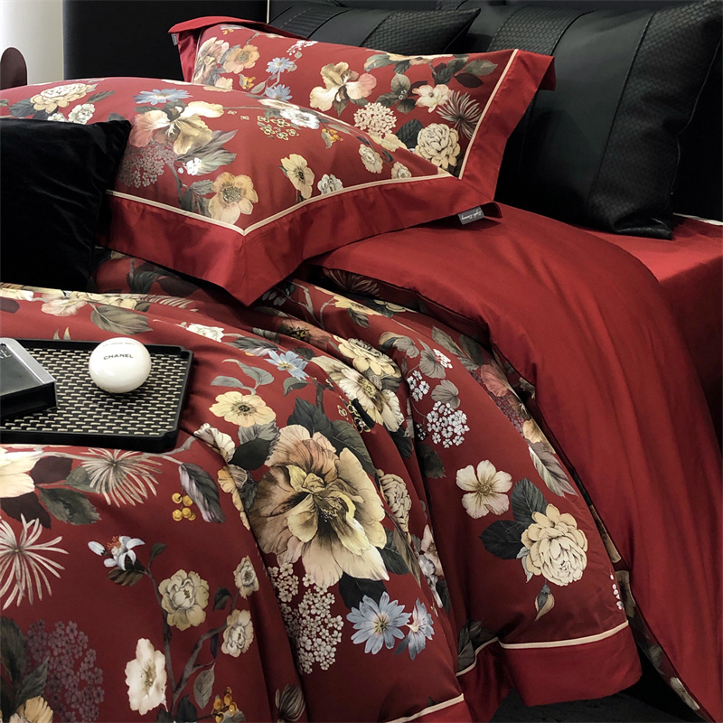 商品名称:初拾 2024新款100支澳棉数码印花四件套-挪威日照 挪威日照-酒红