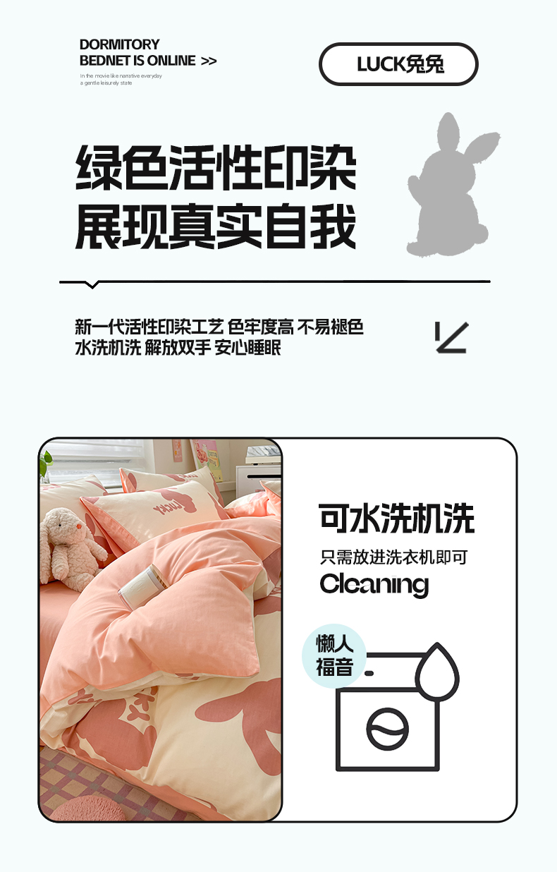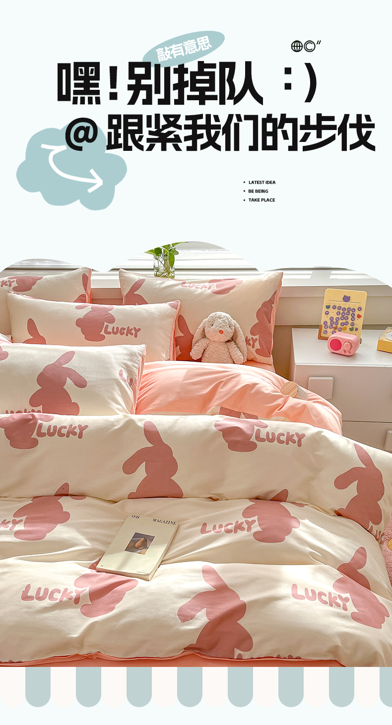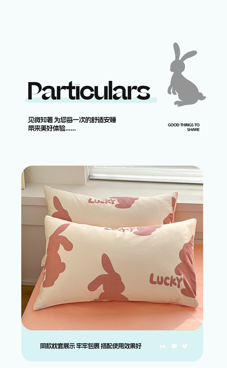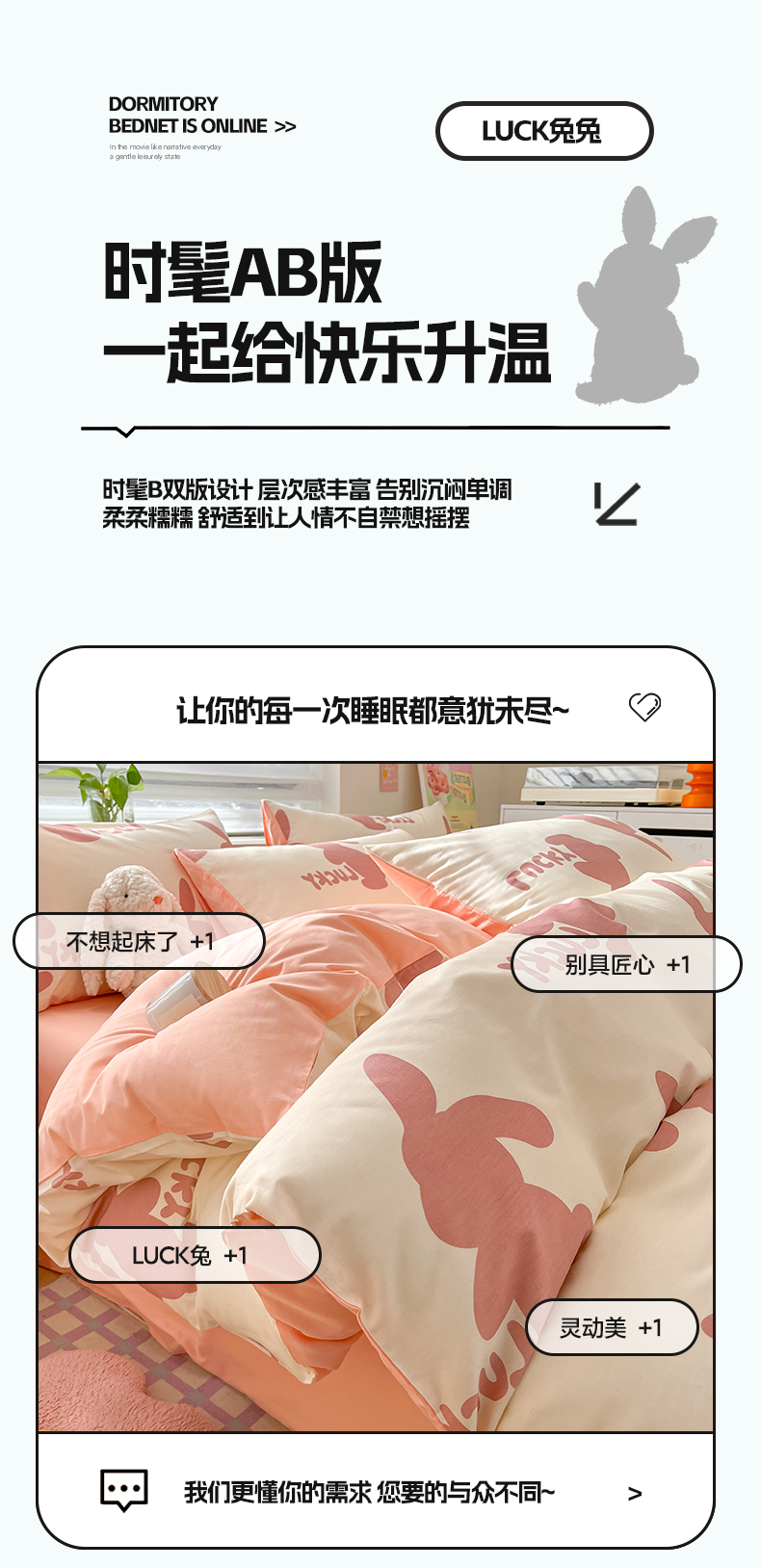 商品名称:雅居纺家纺 2024新款全棉LUCK兔四件套 LUCK兔兔粉