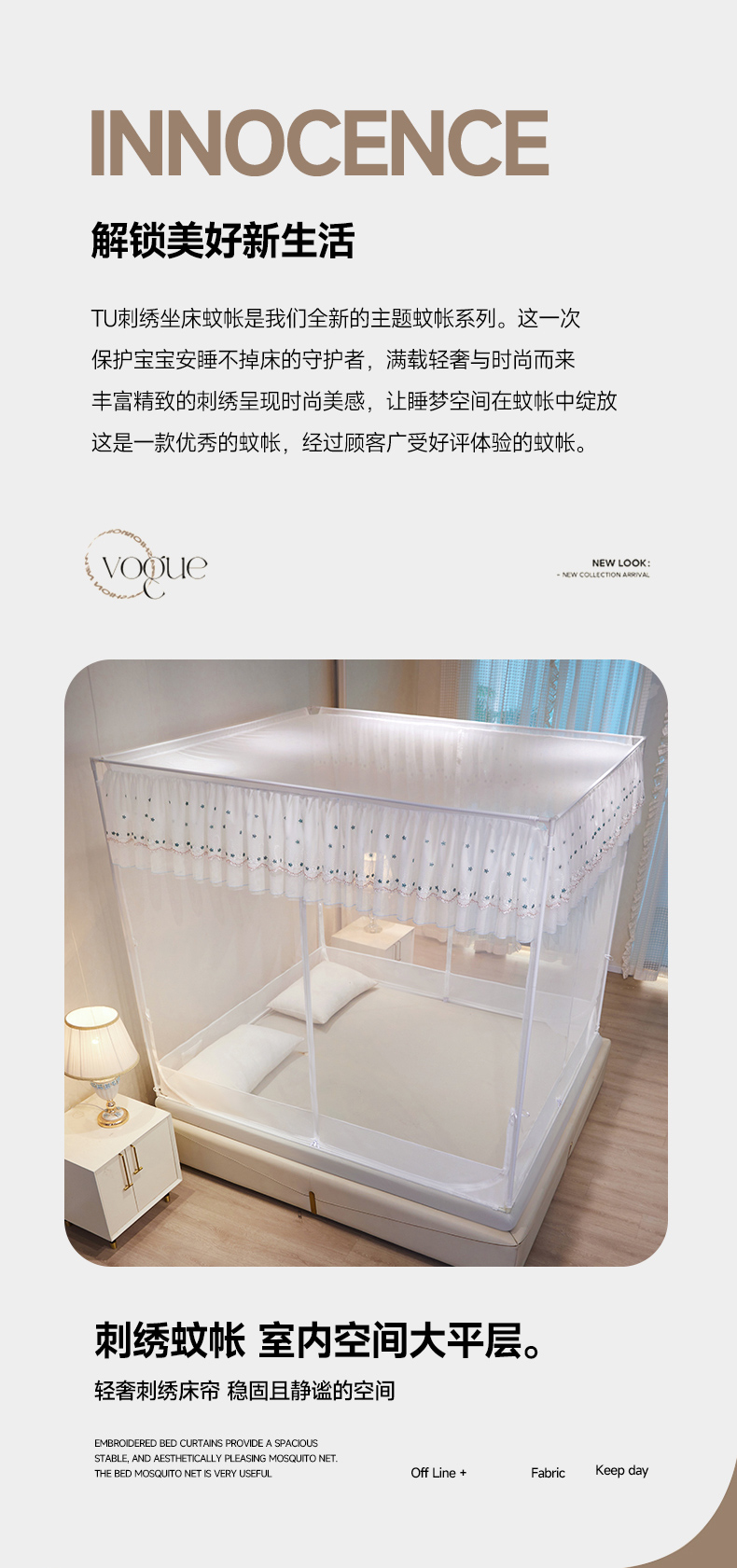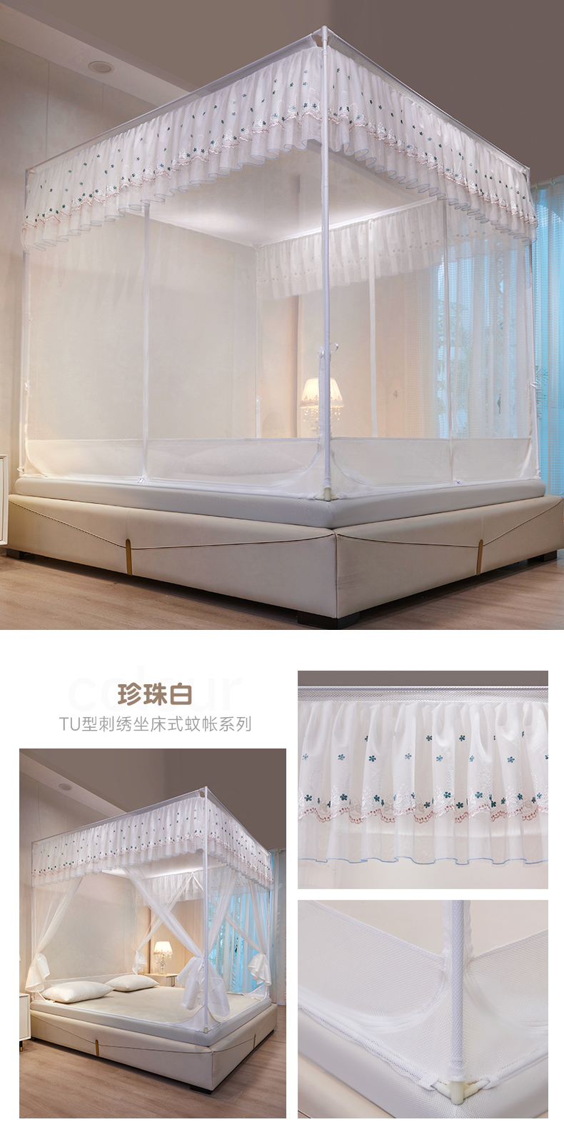 商品名称:富莱星蚊帐 2024新款TU型刺绣坐床蚊帐 珍珠白