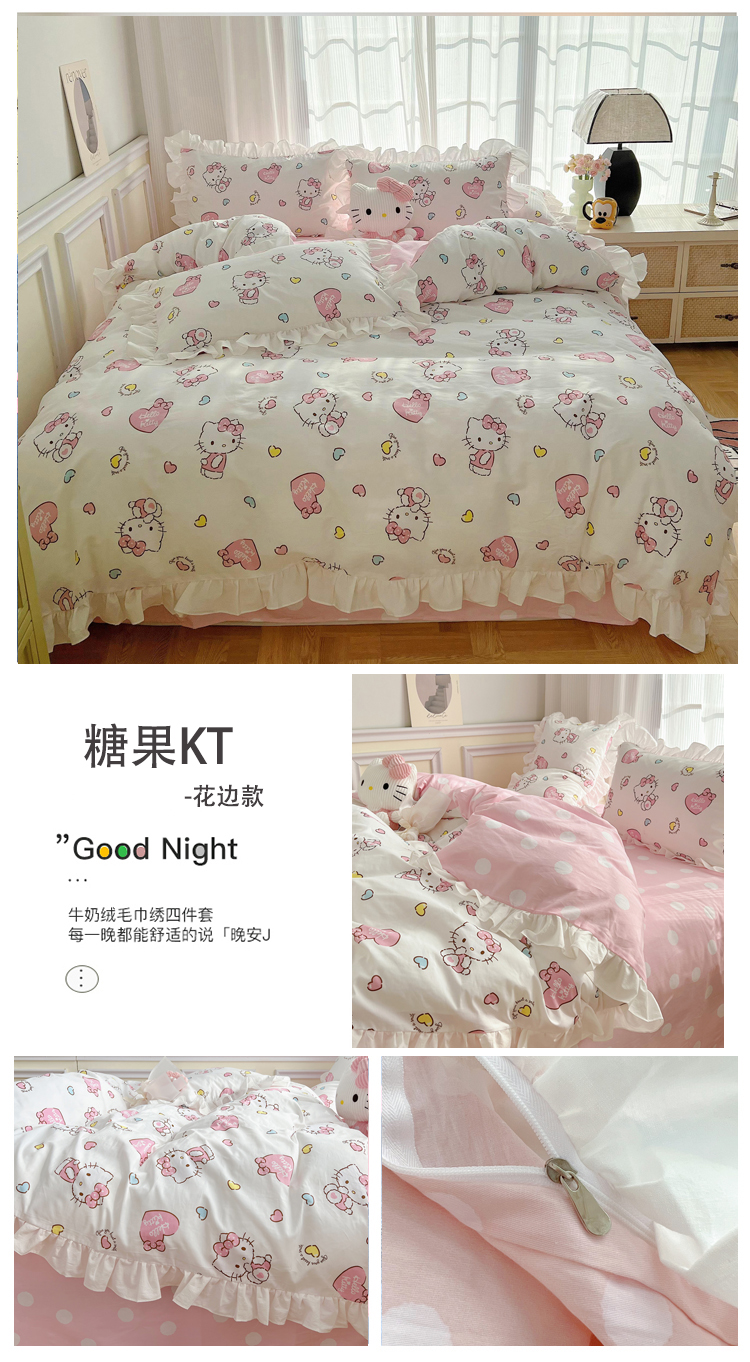 (总)三朵家纺 2024新款牛奶绒绣花四件套三丽鸥系列,草莓公主KT,梦幻旅行,逃学帕恰,淘气宝贝,甜心搬运工,香香公主KT,樱桃美乐蒂