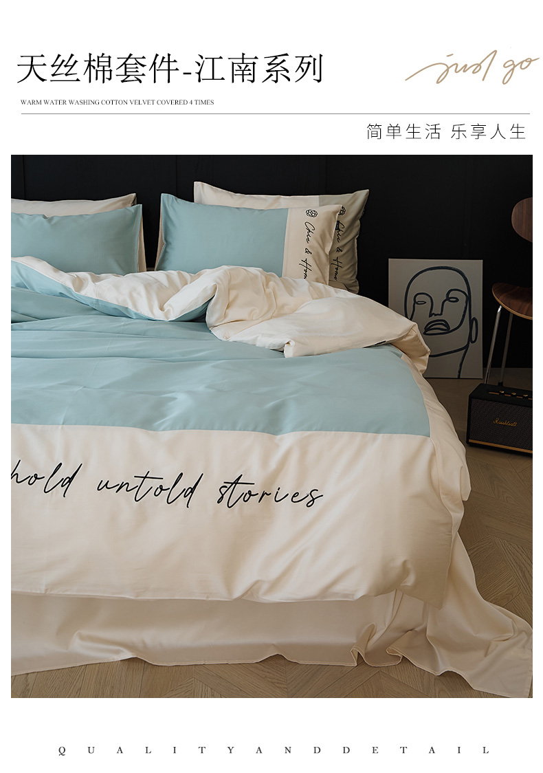 当前位置: 91家纺网 > 商品网购 > 床品套件 > 四件套 > 全棉普通四件套 > 2024春夏新款天丝棉四件套--江南系列(常规图) 江南-翠蓝