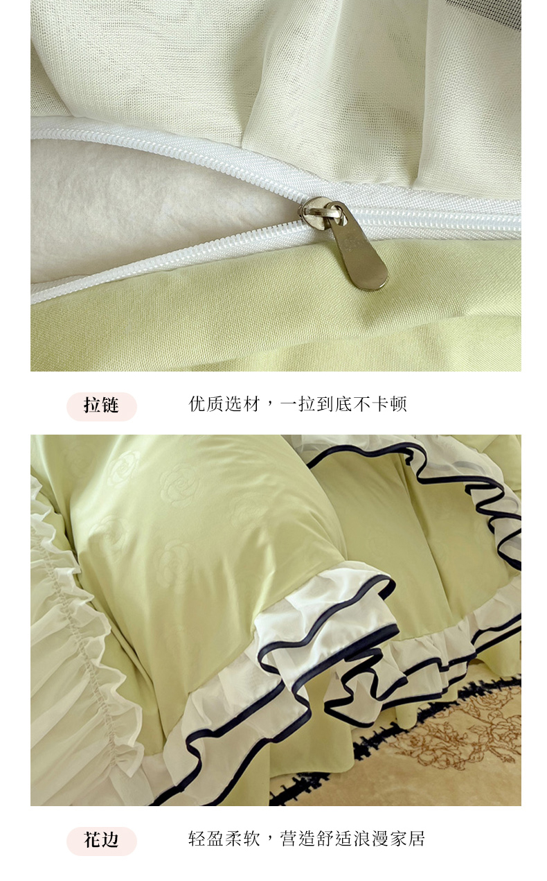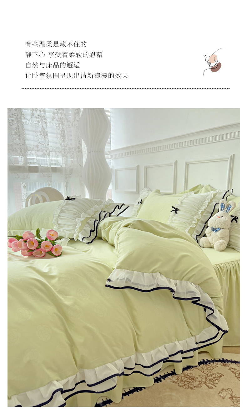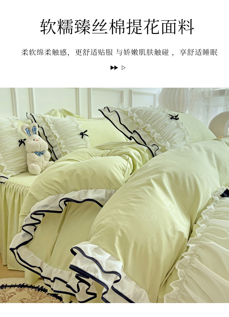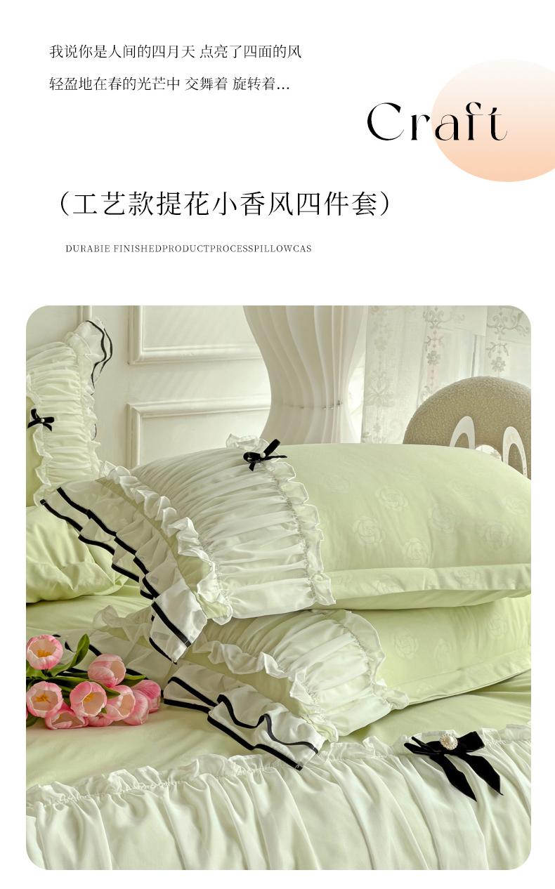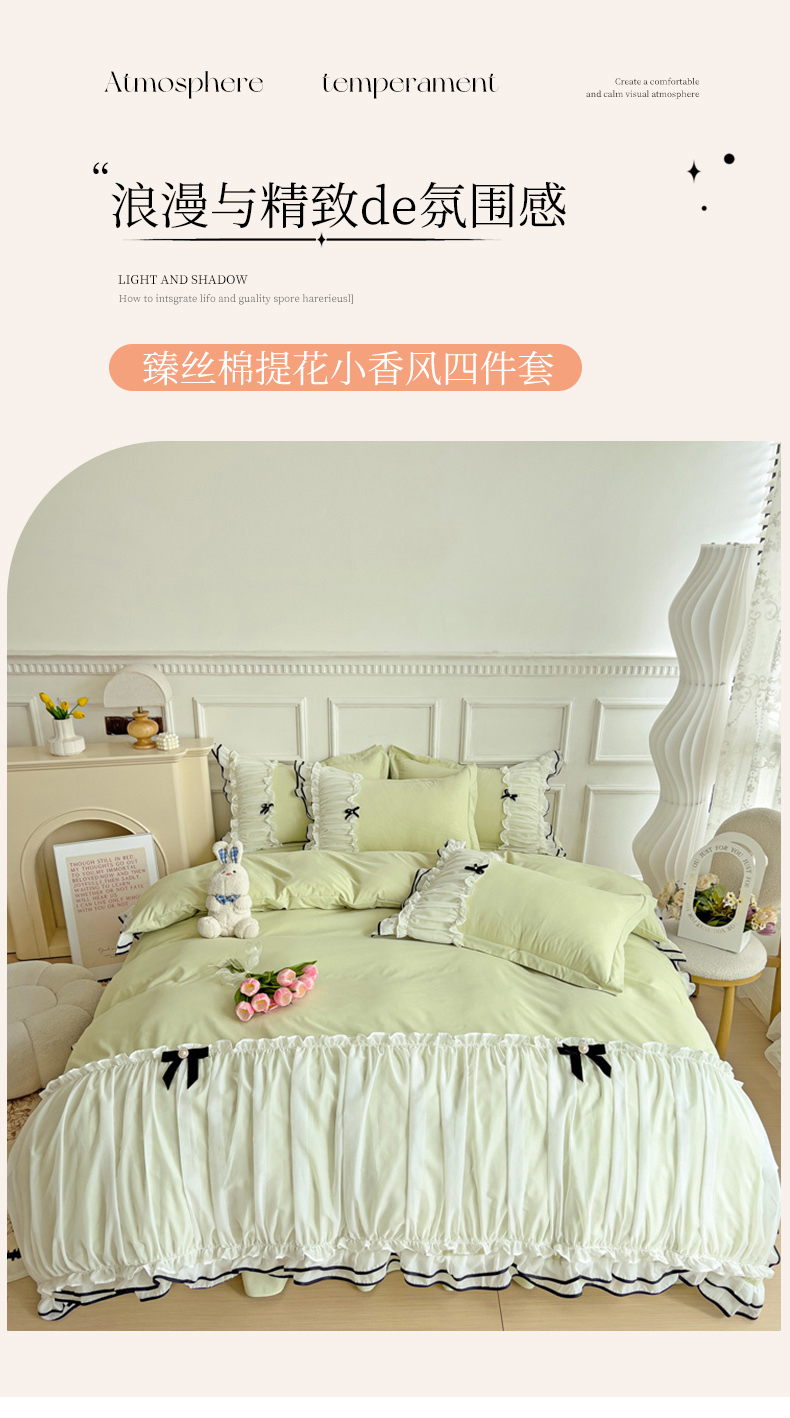 当前位置: 91家纺网 > 商品网购 > 床品套件 > 四件套 > 化纤活性四件套 > 包小包 2024新款臻丝棉小香风提花双层花边韩版公主风四件套(提供买家秀) 小香风-奶绿