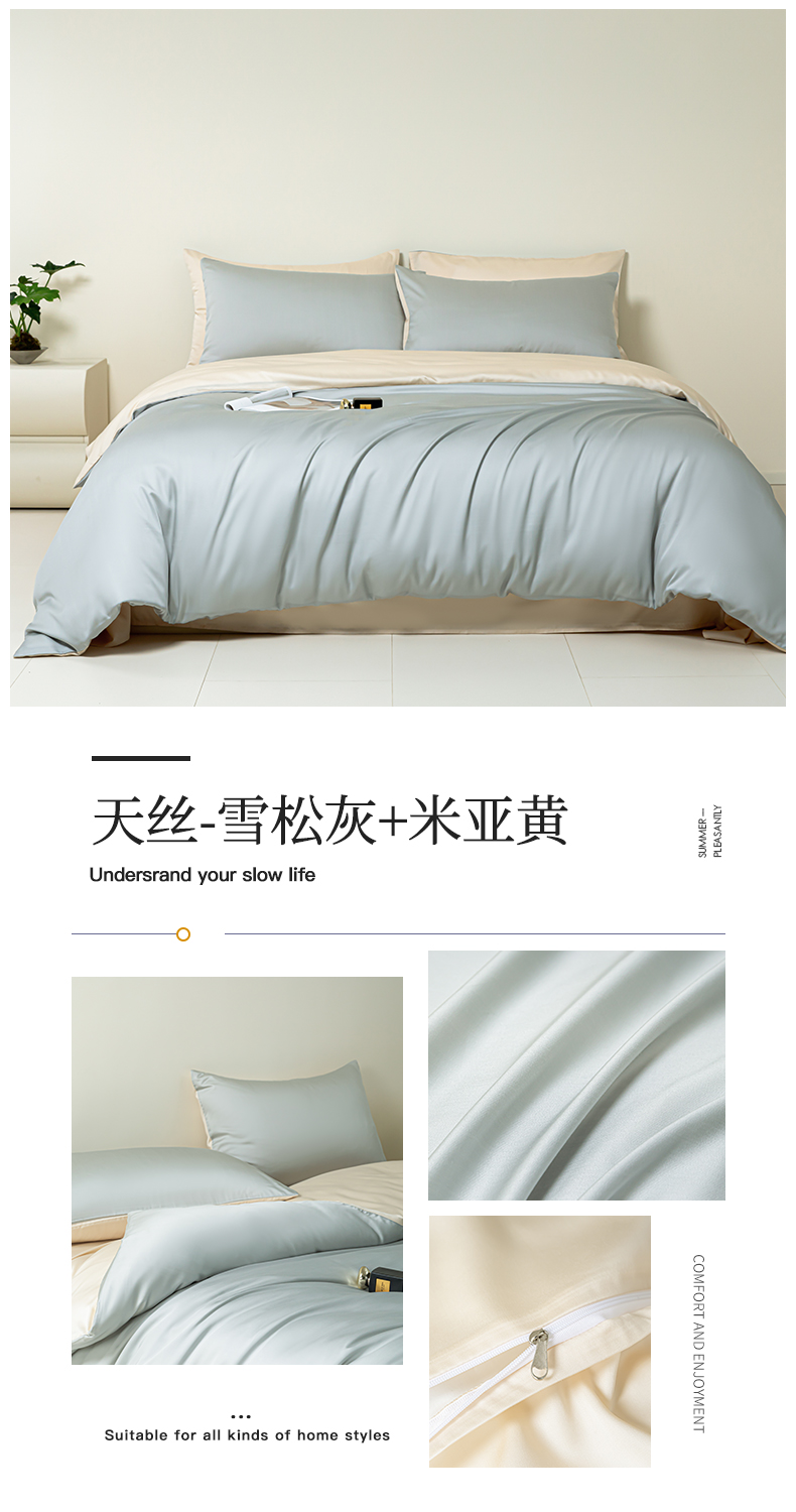 当前位置: 91家纺网 > 商品网购 > 床品套件 > 四件套 > 莱赛尔四件套 > 慕色家纺 2024新款高支莱赛尔天丝纯色拼色四件套 天丝-雪松灰+米亚黄
