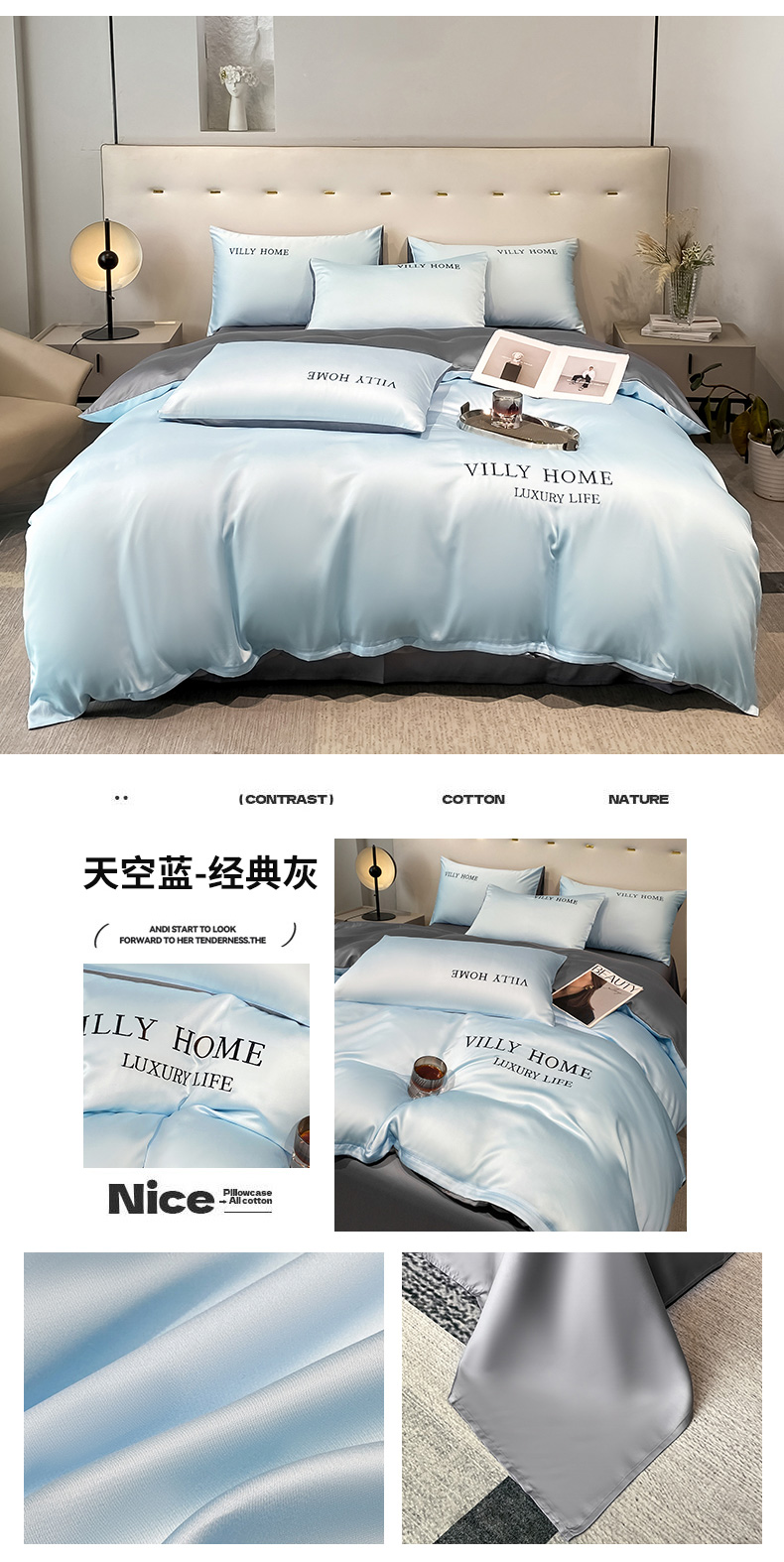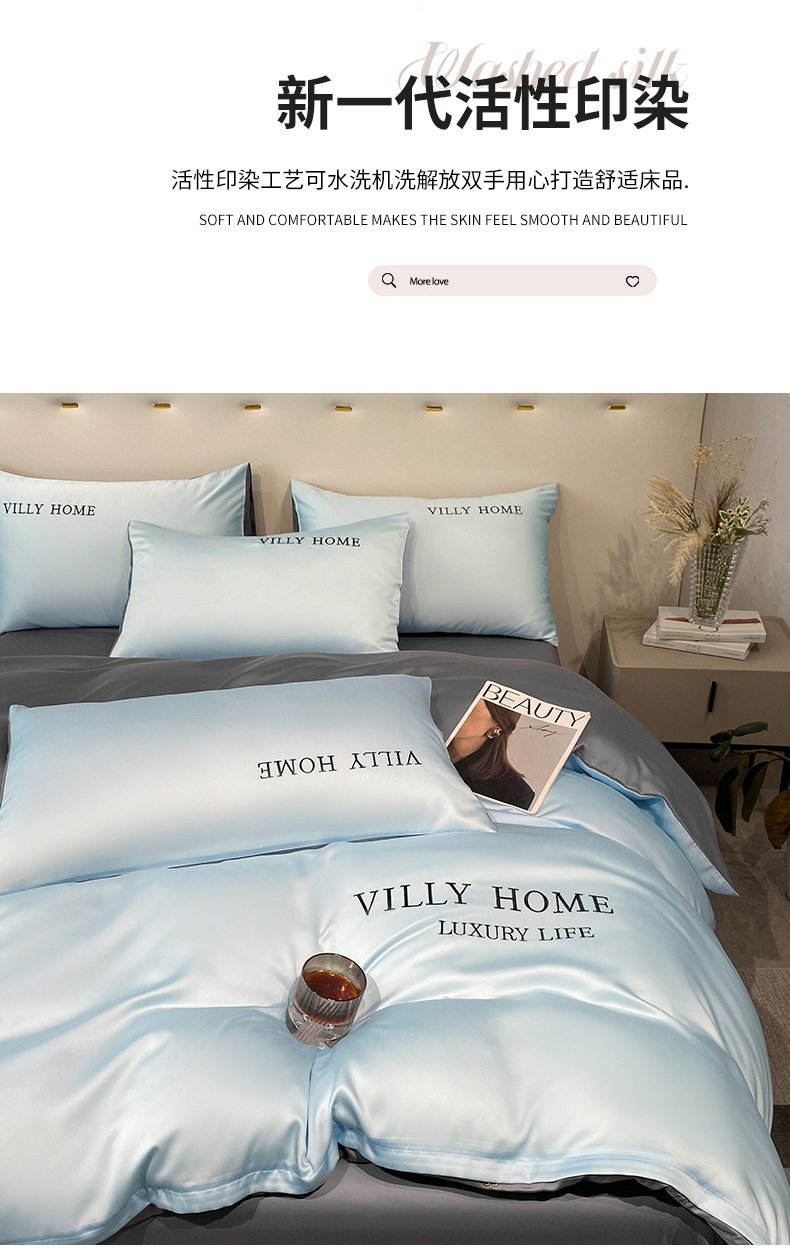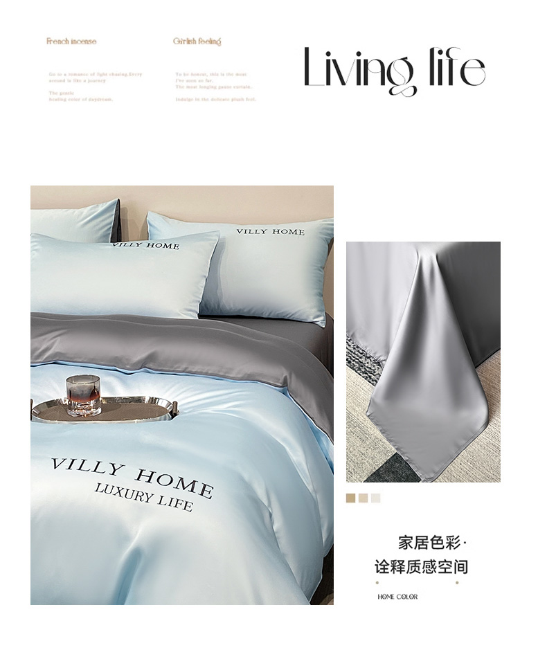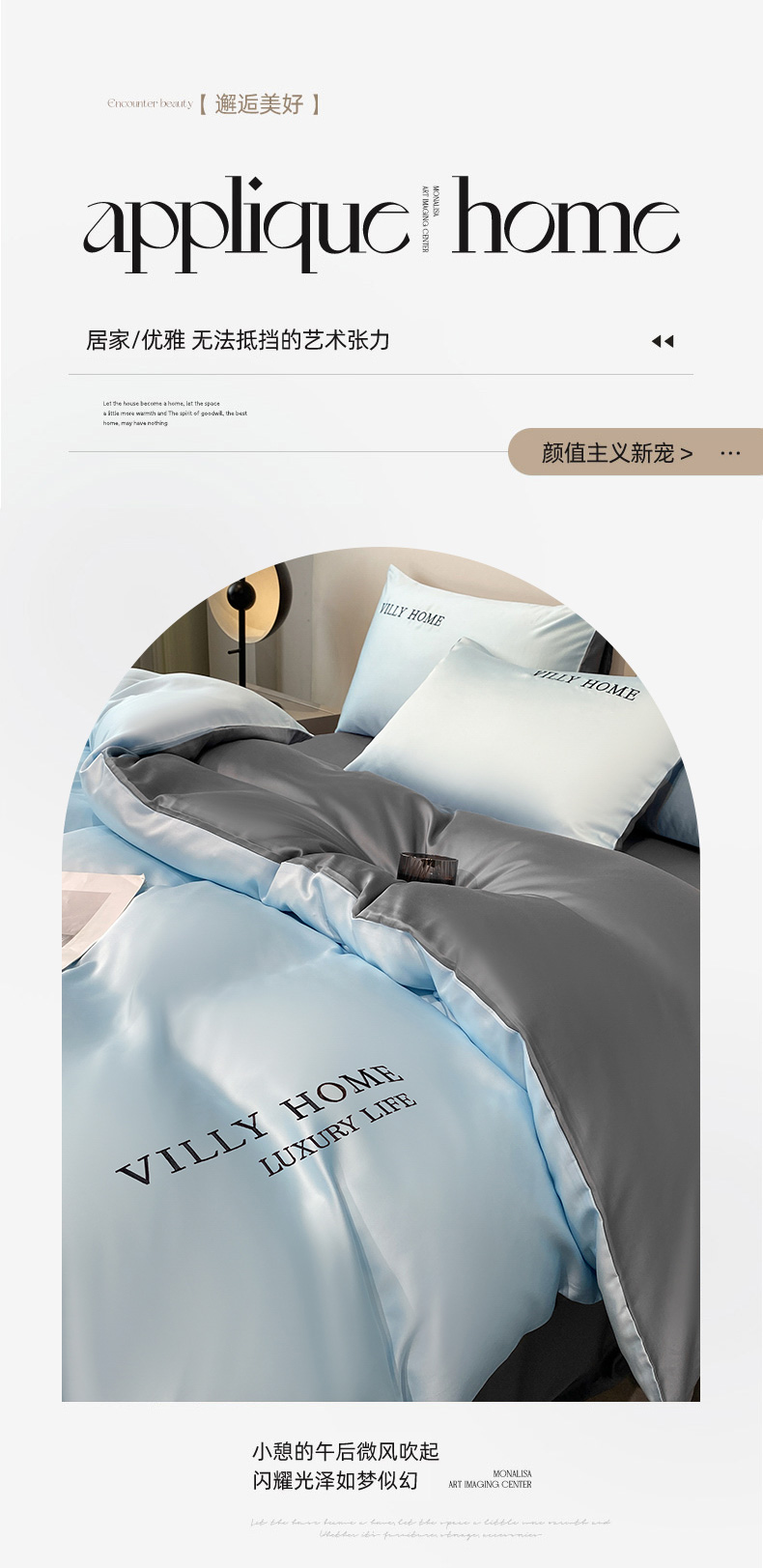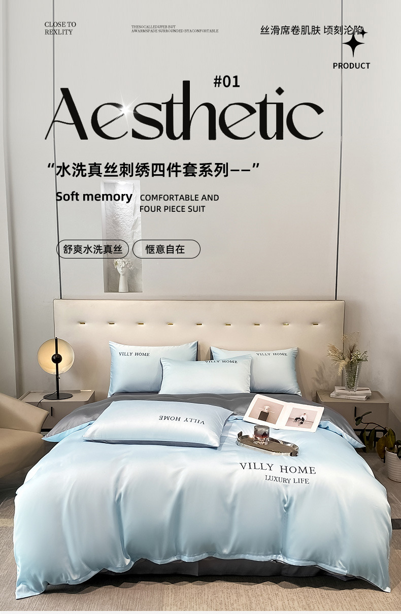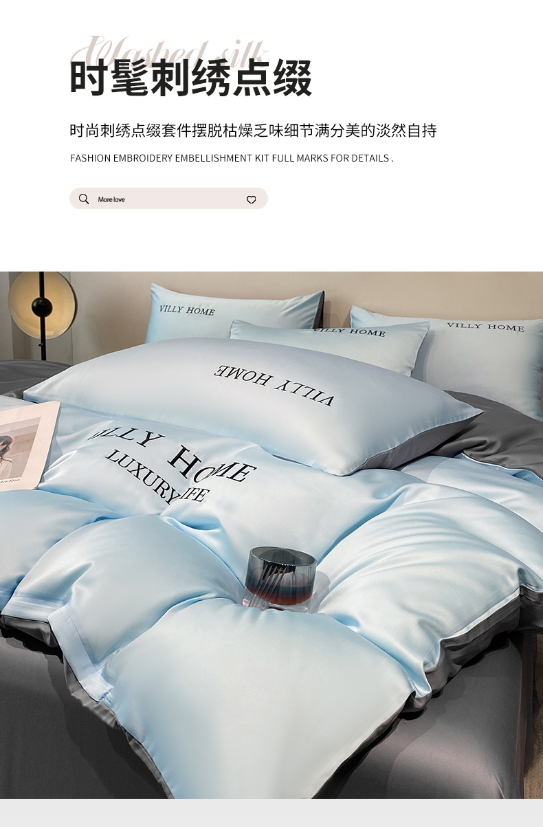当前位置: 91家纺网 > 商品网购 > 床品套件 > 四件套 > 水洗真丝四件套 > 眠帛家居 2024新款水洗真丝绣花四件套-惟丽系列 天空蓝-经典灰