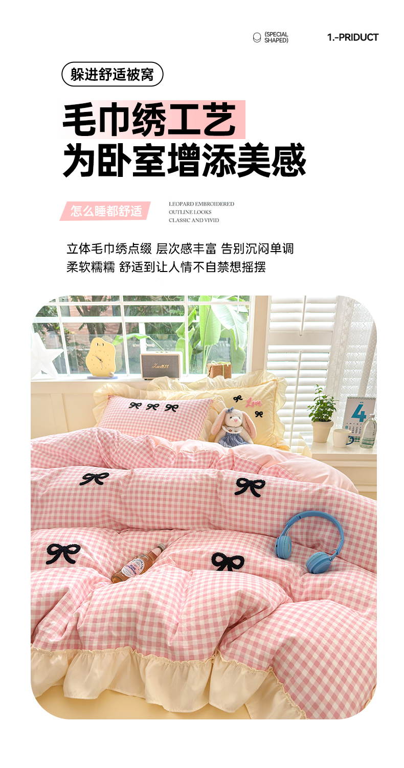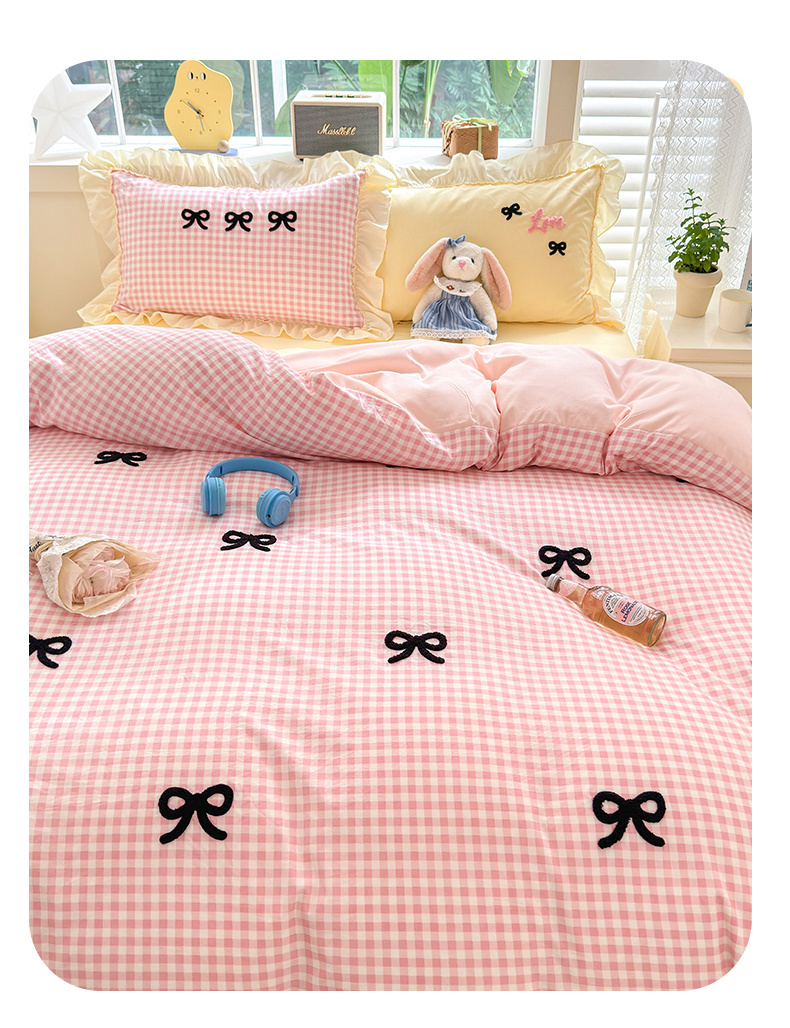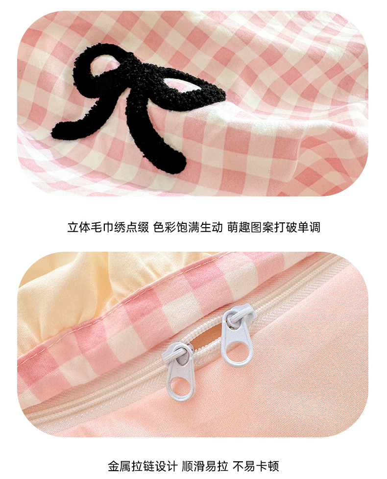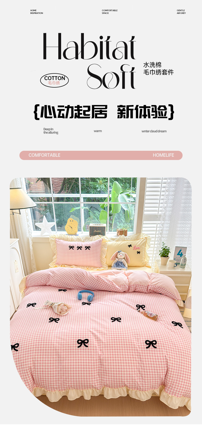 当前位置: 91家纺网 > 商品网购 > 床品套件 > 四件套 > 水洗棉四件套 > 我心 2024新款水洗棉毛巾绣四件套-蝴蝶结 黑蝴蝶结-粉格黄
