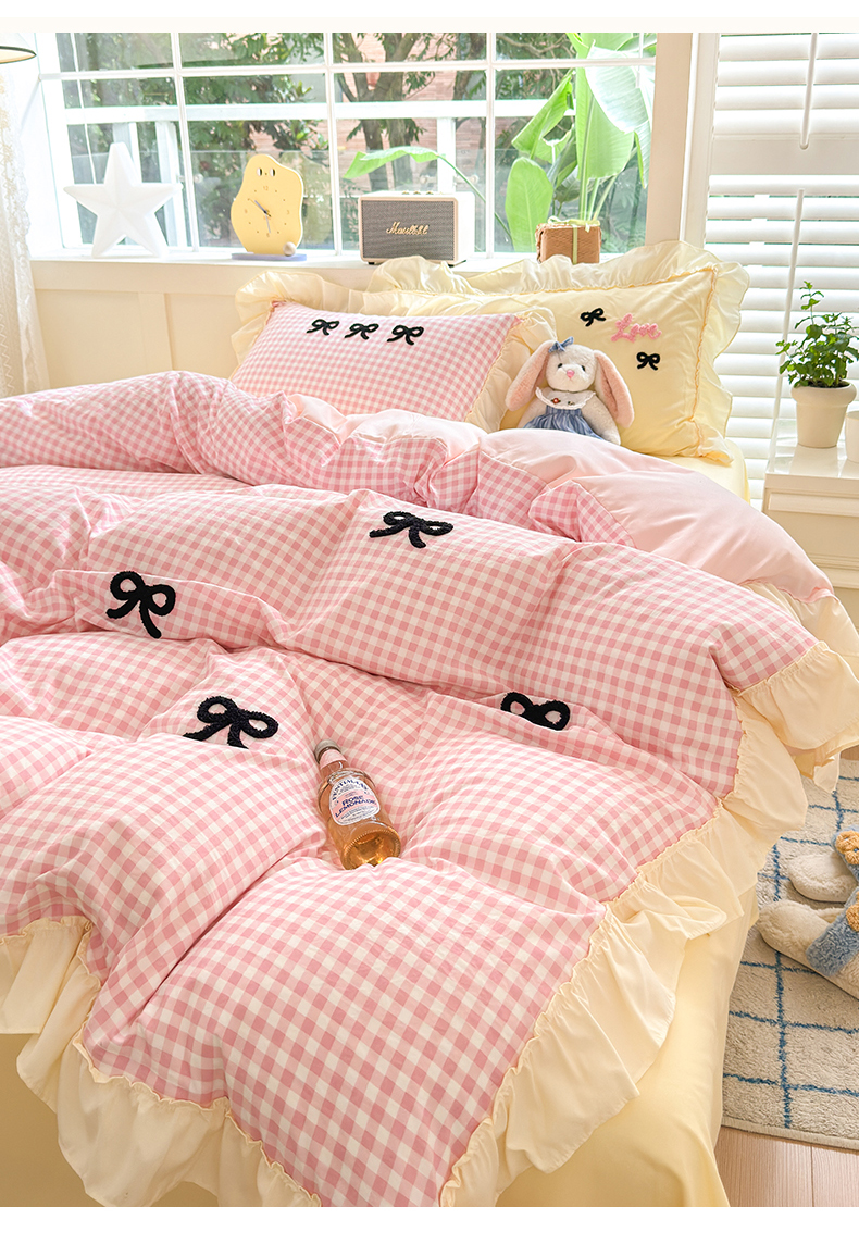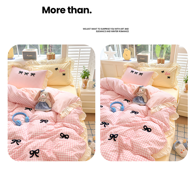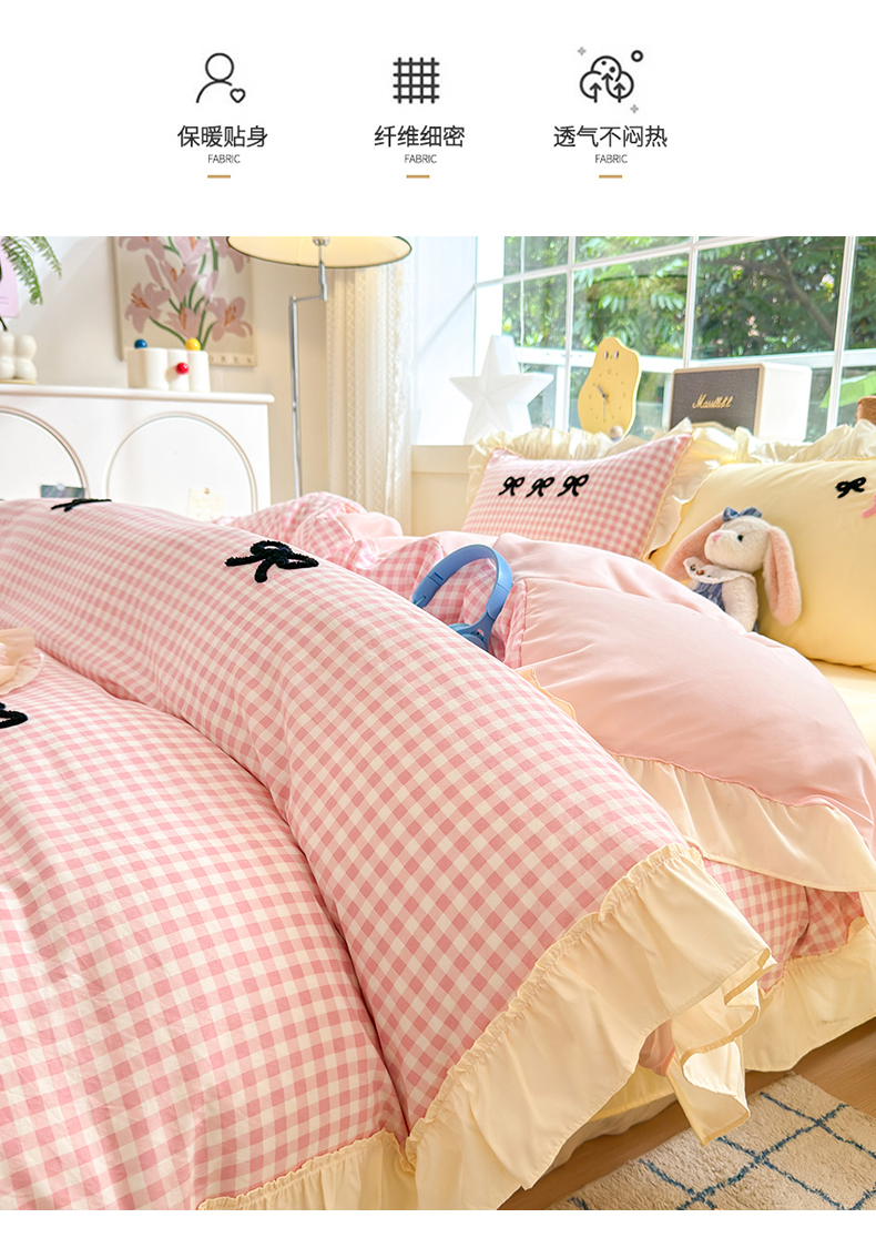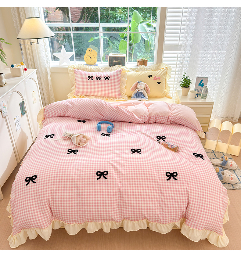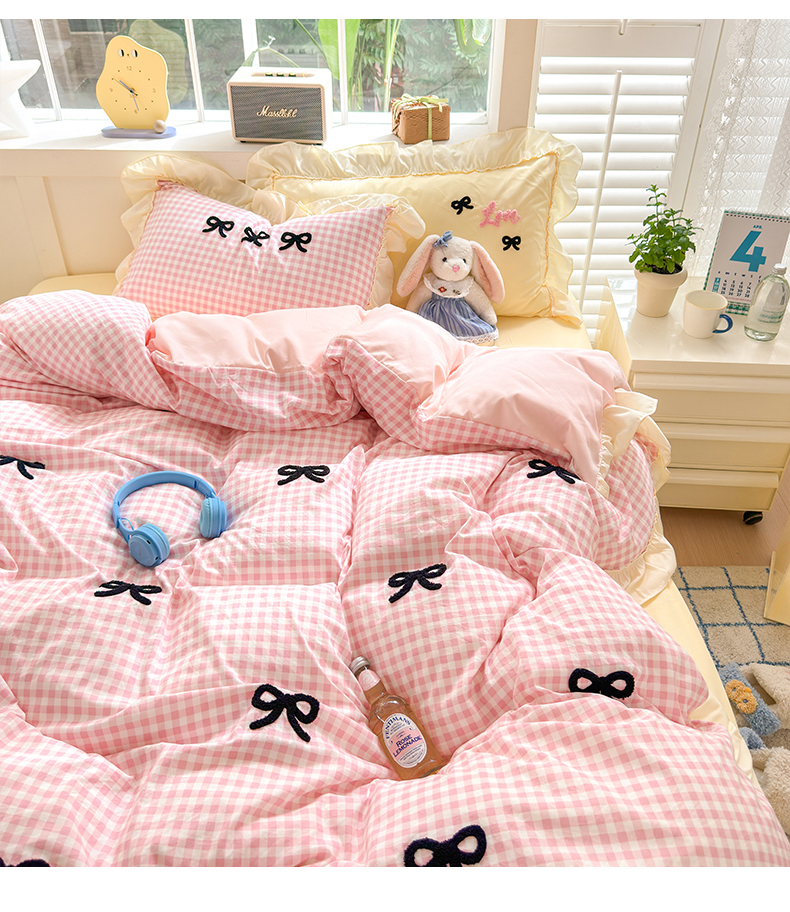当前位置: 91家纺网 > 商品网购 > 床品套件 > 四件套 > 水洗棉四件套 > 我心 2024新款水洗棉毛巾绣四件套-蝴蝶结 黑蝴蝶结-粉格黄