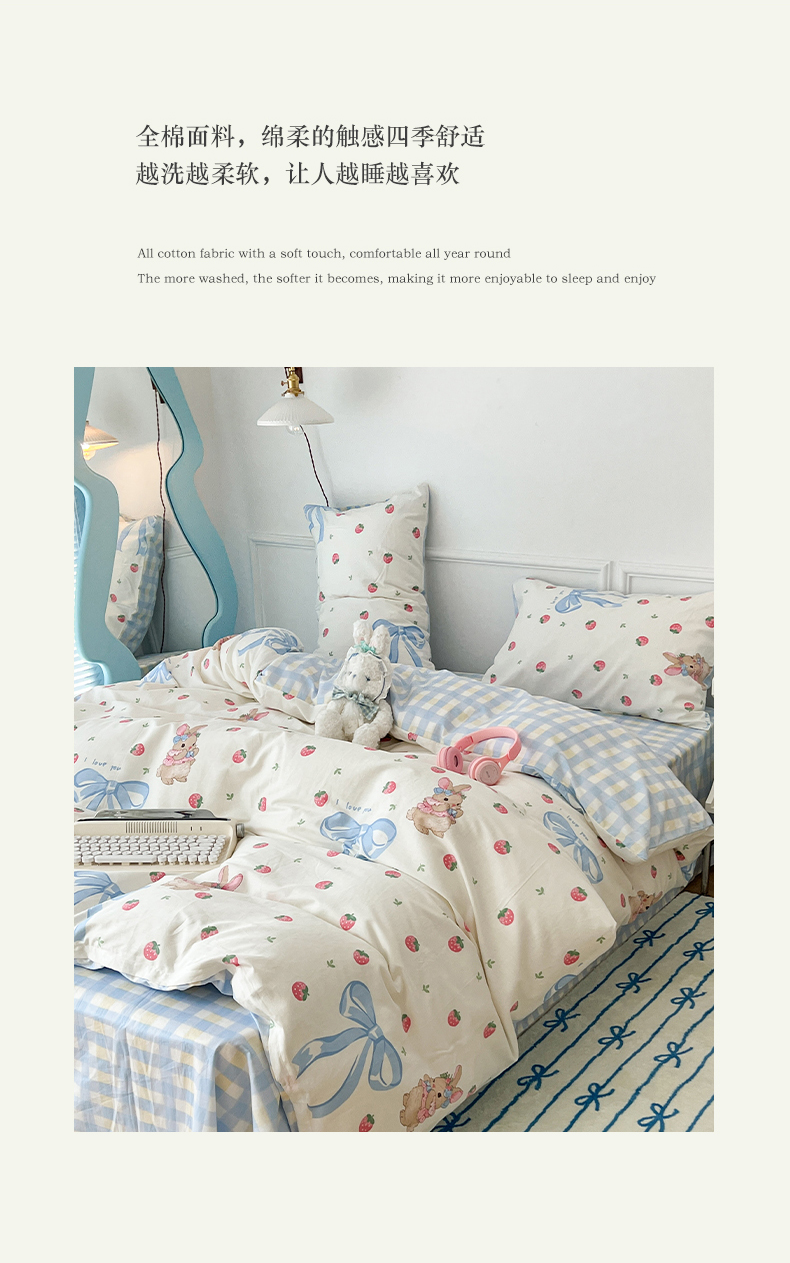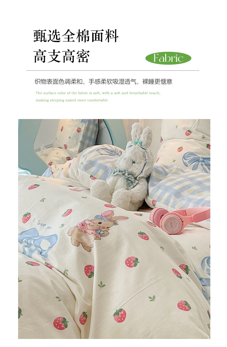 商品名称:2024新款13070跑量款全棉四件套--卡通系列 蝴蝶结草莓兔