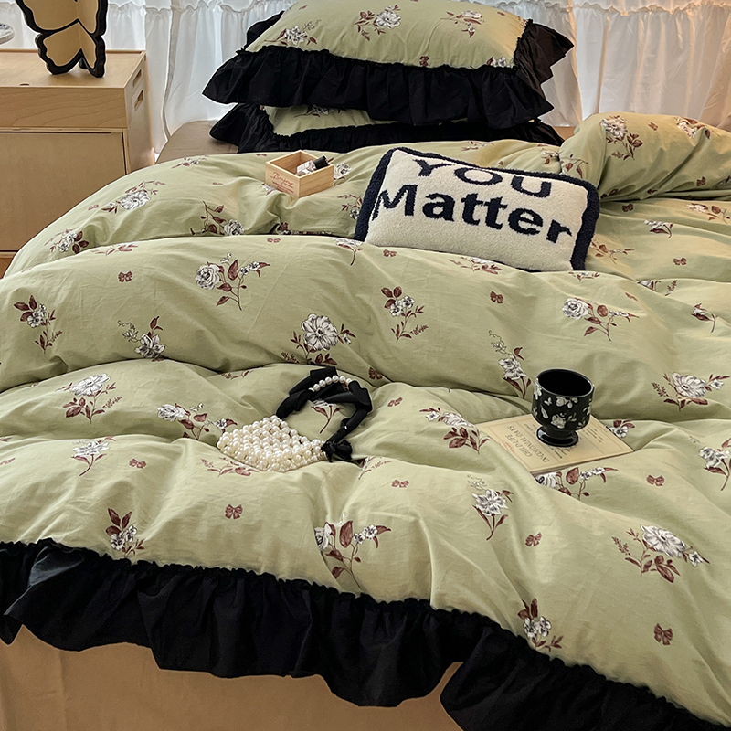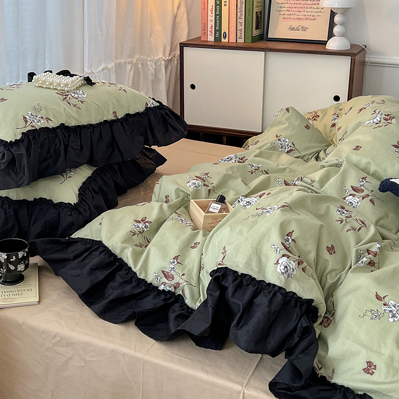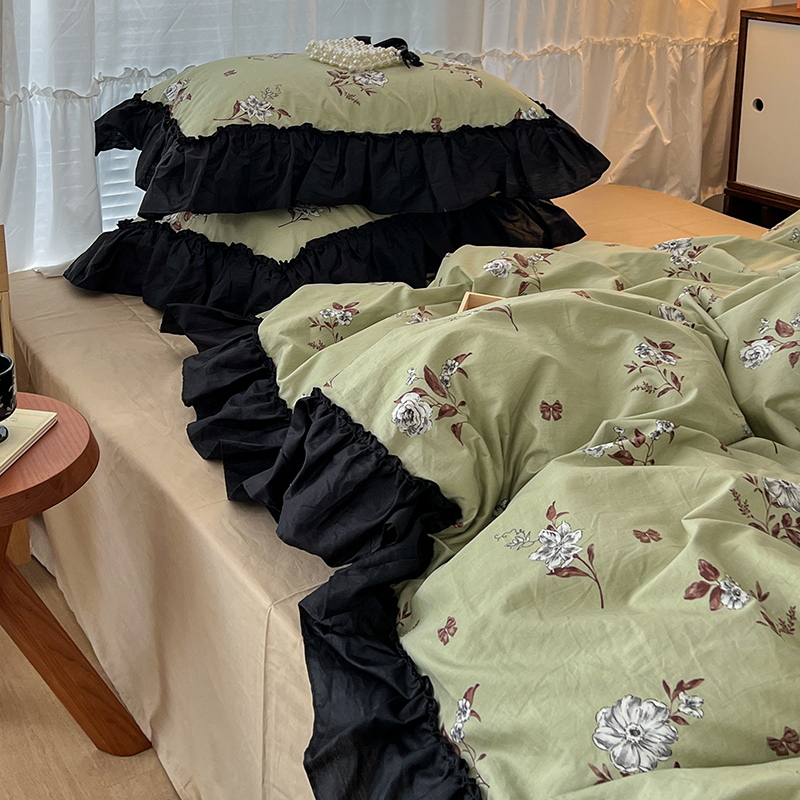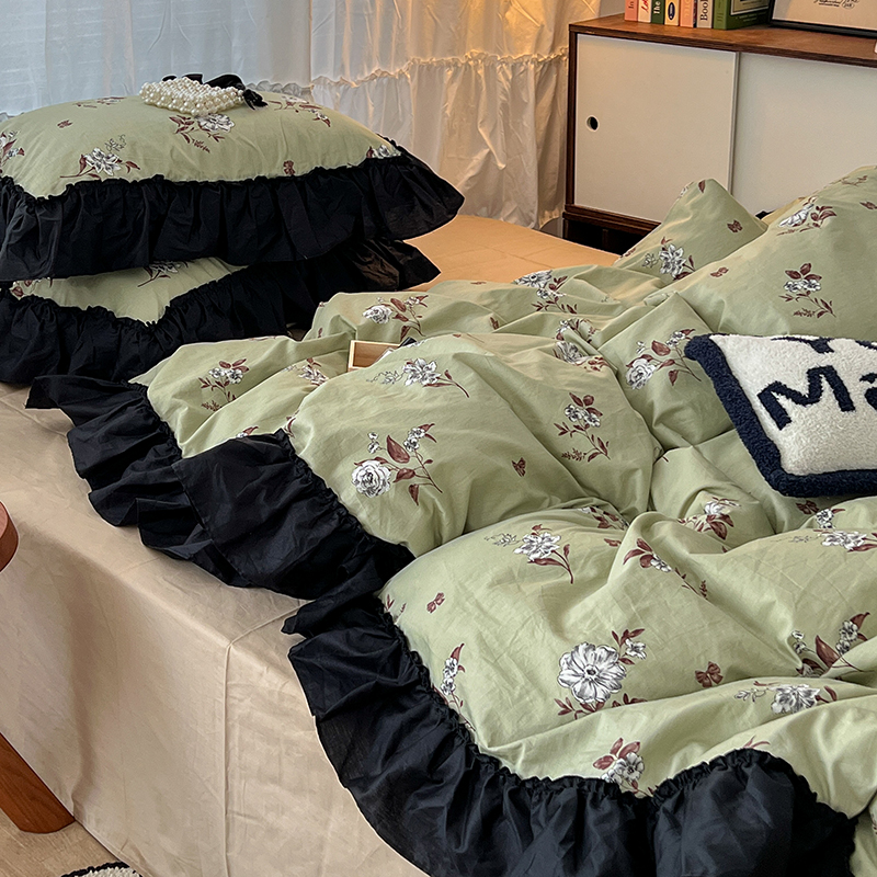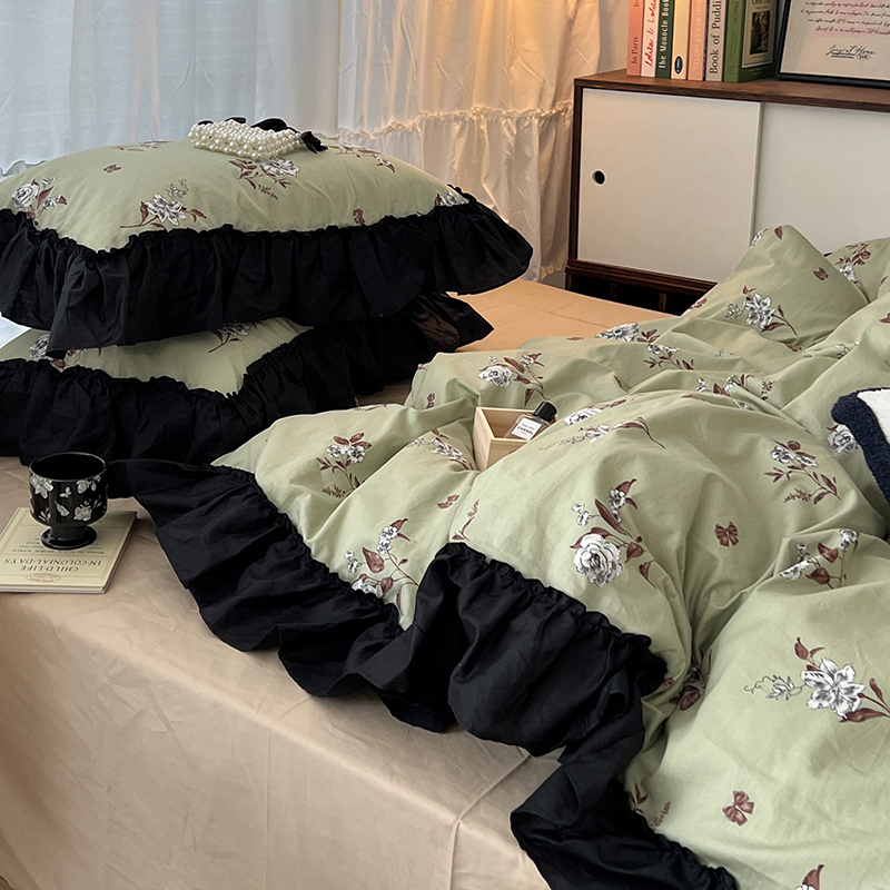 昔可家纺 2024黑色贴边花边全棉款四件套 海瑟薇