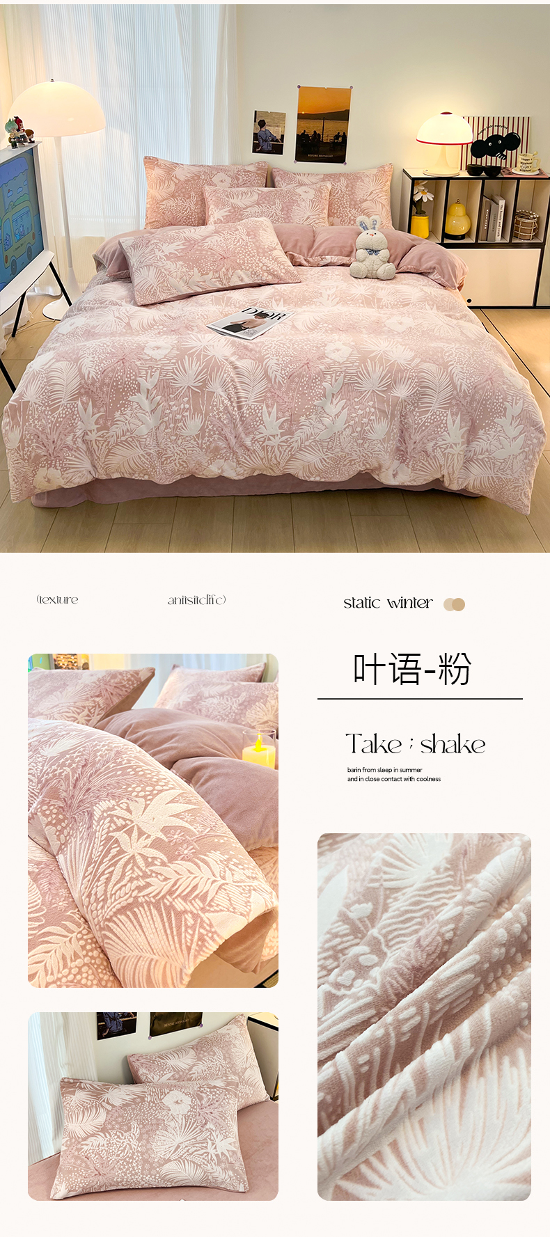 当前位置: 91家纺网 > 商品网购 > 床品套件 > 四件套 > 牛奶绒四件套 > 2024新款原创白色小清新场景雕花牛奶绒单被套四件套 叶语-粉