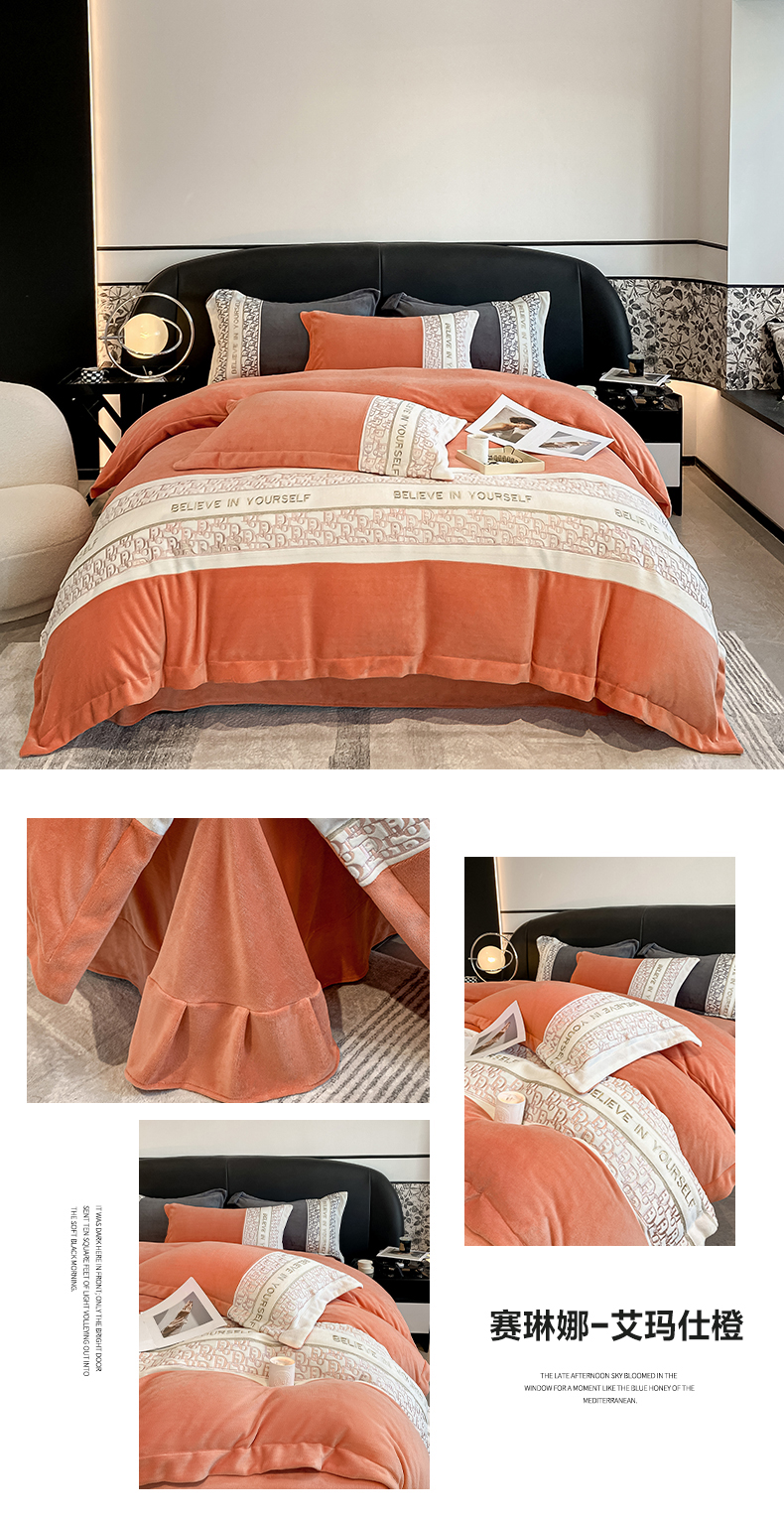 苹果星家纺 2024新款秋冬高定系列立体刺绣230g全消光牛奶绒-赛琳娜 赛琳娜-艾玛橙