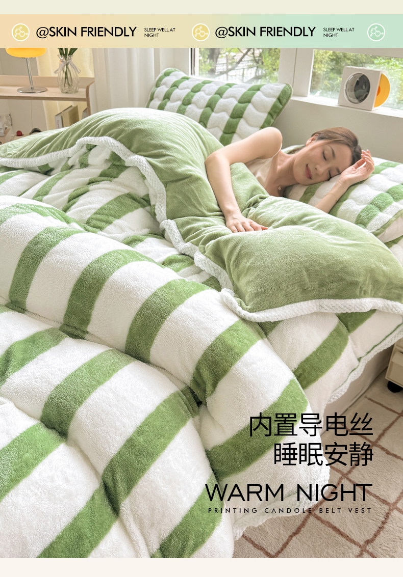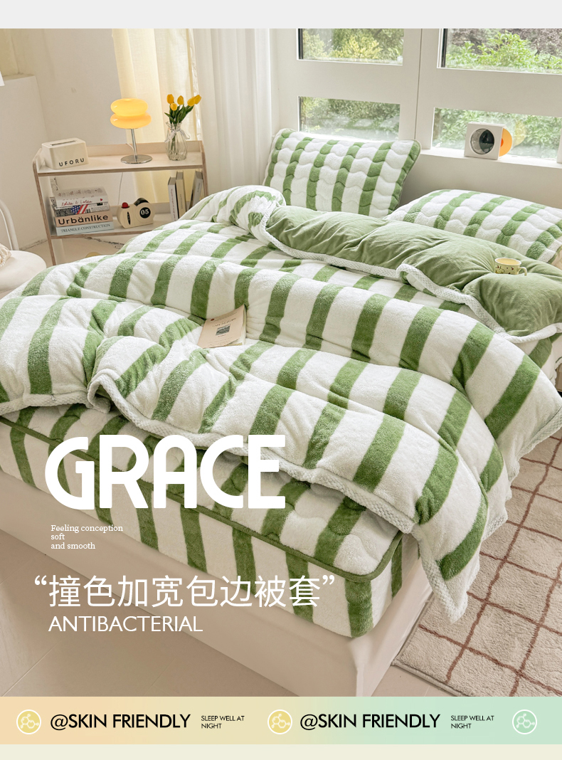 2024新款A类北极绒格子-条纹系列宽包边加厚被套(自然光图) 条纹-豆绿