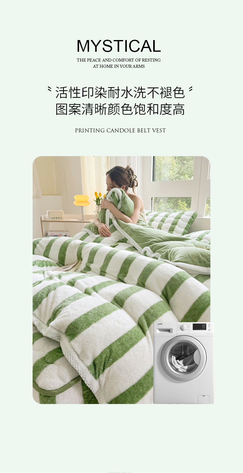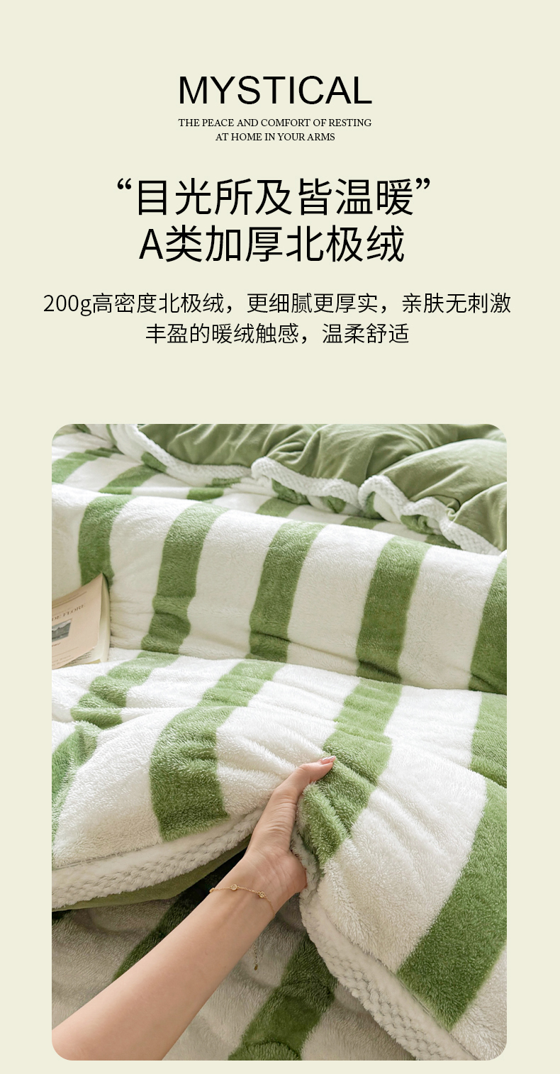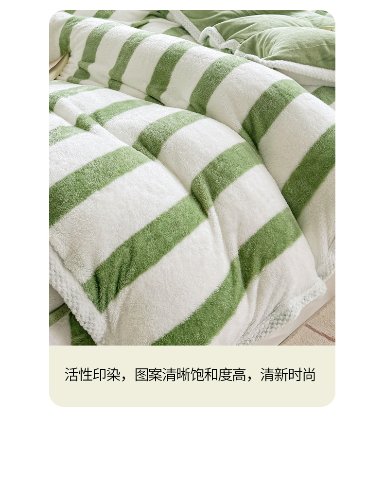 商品名称:2024新款A类北极绒格子-条纹系列宽包边加厚被套(自然光图) 条纹-豆绿